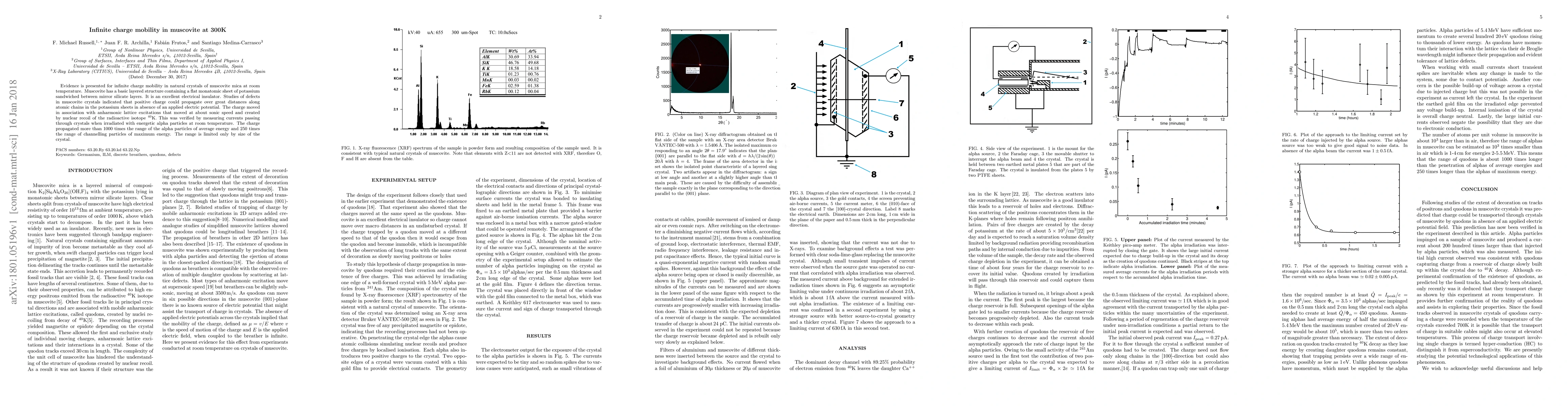 This study demonstrates infinite charge mobility in muscovite mica at room temperature, facilitated by charge propagation along potassium sheets via anharmonic lattice excitations. This charge movement is initiated by nuclear recoil from K40 decay and verified by alpha particle irradiation.