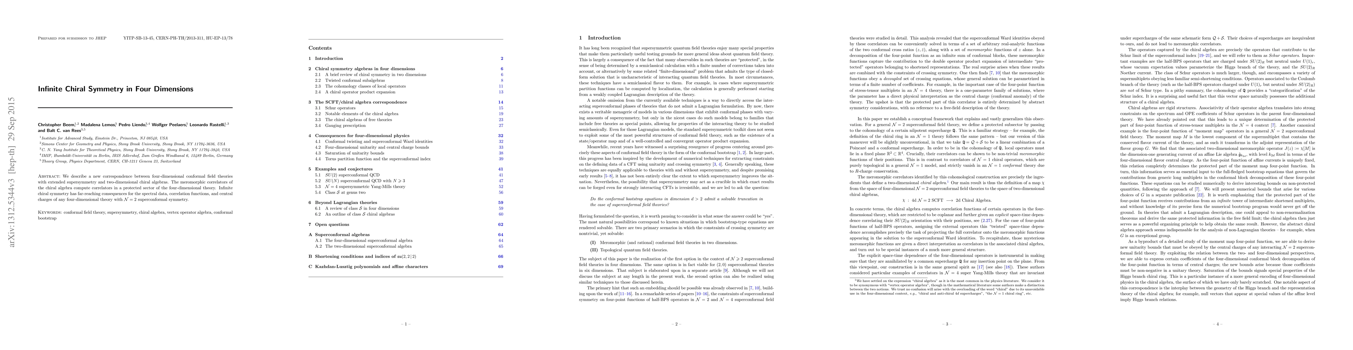 This paper establishes a new correspondence linking four-dimensional conformal field theories with extended supersymmetry to two-dimensional chiral algebras, revealing that meromorphic correlators of the chiral algebra correspond to protected sector correlators in the four-dimensional theory, with infinite chiral symmetry significantly impacting spectral data, correlation functions, and central charges.