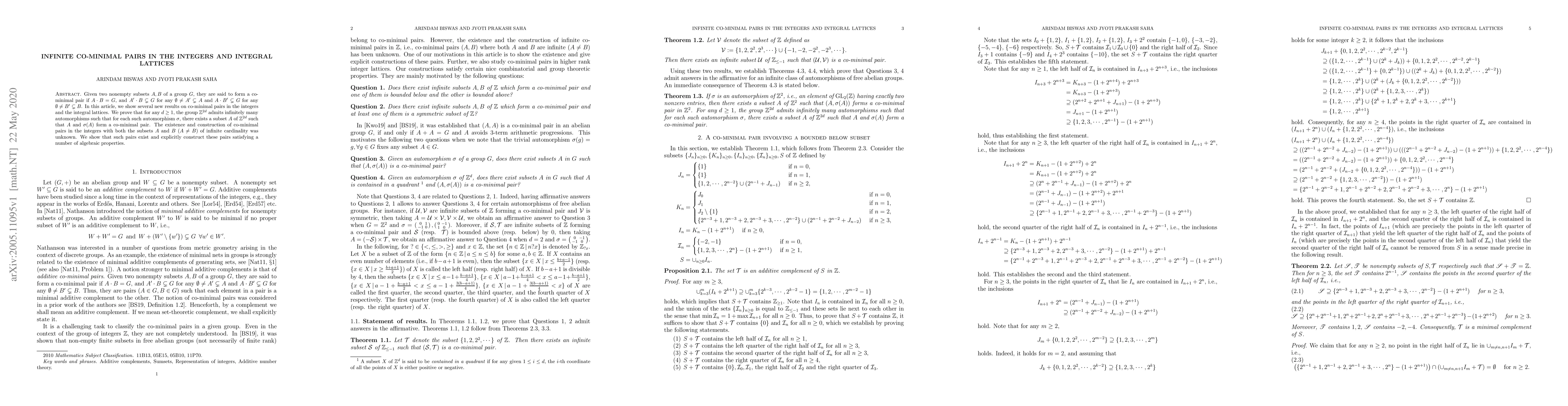 Given two nonempty subsets $A, B$ of a group $G$, they are said to form a co-minimal pair if $A \cdot B = G$, and $A' \cdot B \subsetneq G$ for any $\emptyset \neq A' \subsetneq A$ and $A\cdot B' \subsetneq G$ for any $\emptyset \neq B' \subsetneq B$. In this article, we show several new results on co-minimal pairs in the integers and the integral lattices. We prove that for any $d\geq 1$, the group $\mathbb{Z}^{2d}$ admits infinitely many automorphisms such that for each such automorphism $\sigma$, there exists a subset $A$ of $\mathbb{Z}^{2d}$ such that $A$ and $\sigma(A)$ form a co-minimal pair. The existence and construction of co-minimal pairs in the integers with both the subsets $A$ and $B$ ($A\neq B$) of infinite cardinality was unknown. We show that such pairs exist and explicitly construct these pairs satisfying a number of algebraic properties.