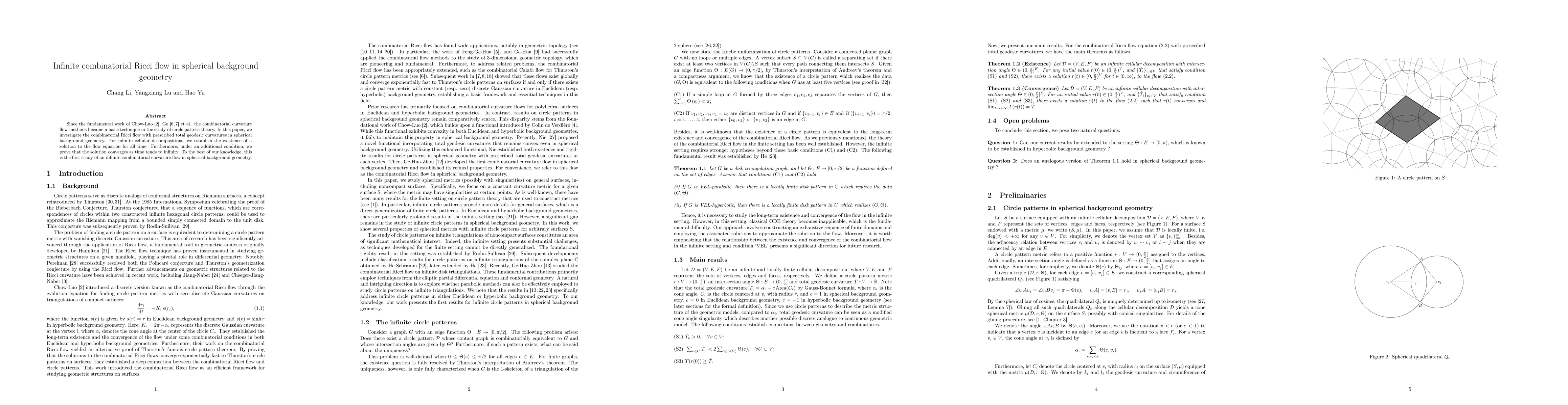 The paper presents a novel approach to combinatorial Ricci flow in spherical background geometry, proving existence and convergence of solutions for infinite decompositions.
