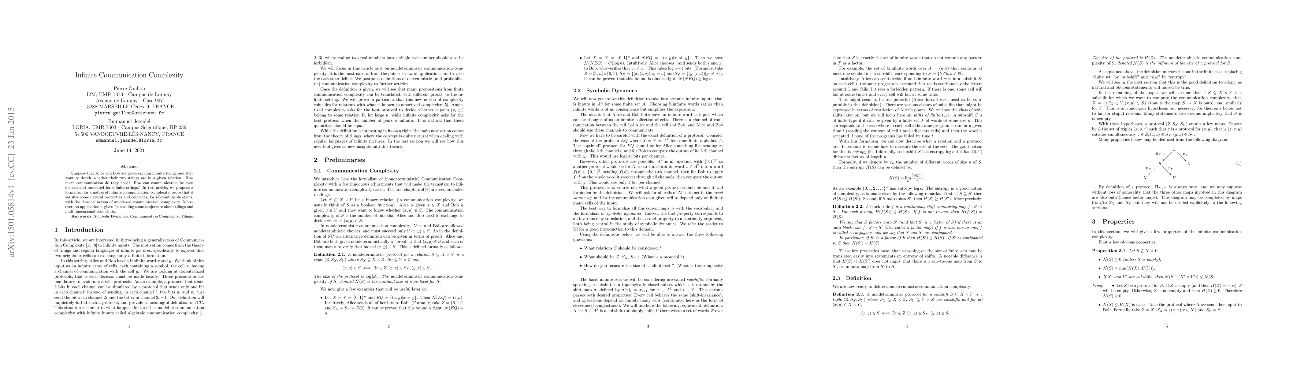 Suppose that Alice and Bob are given each an infinite string, and they want to decide whether their two strings are in a given relation. How much communication do they need? How can communication be even defined and measured for infinite strings? In this article, we propose a formalism for a notion of infinite communication complexity, prove that it satisfies some natural properties and coincides, for relevant applications, with the classical notion of amortized communication complexity. More-over, an application is given for tackling some conjecture about tilings and multidimensional sofic shifts.