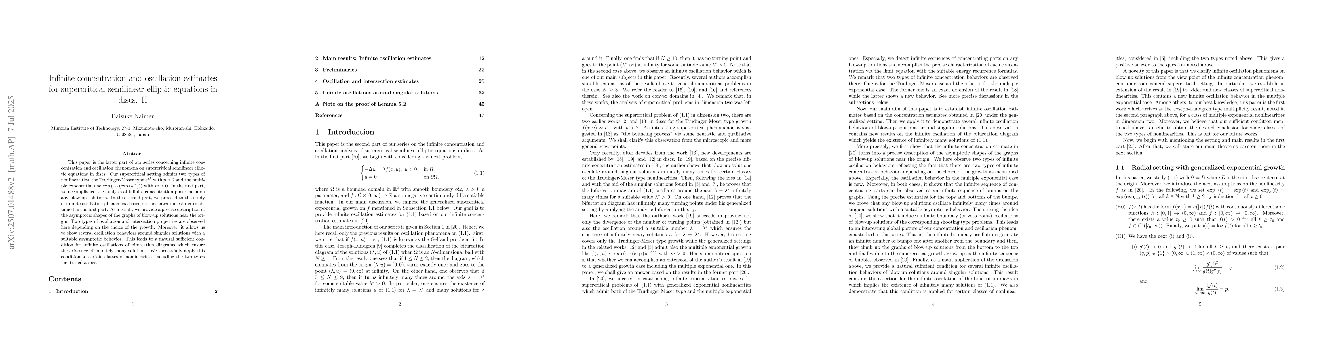 This paper is the latter part of our series concerning the infinite concentration and oscillation phenomena on supercritical semilinear elliptic equations in discs. Our supercritical setting admits two types of nonlinearities, the Trudinger-Moser type $e^{u^p}$ with $p>2$ and the multiple exponential one $\exp{(\cdots(\exp{(u^m)}))}$ with $m>0$. In the first part, we accomplished the analysis of infinite concentration phenomena on any blow-up solutions. In this second part, we proceed to the study of infinite oscillation phenomena based on the concentration estimates obtained in the first part. As a result, we provide a precise description of the asymptotic shapes of the graphs of blow-up solutions near the origin. This allows us to show several infinite oscillation behaviors around singular solutions with a suitable asymptotic behavior. In particular, we arrive at a natural sufficient condition for infinite oscillations of bifurcation diagrams which ensure the existence of infinitely many solutions. We successfully apply this condition to certain classes of nonlinearities including the two types mentioned above.