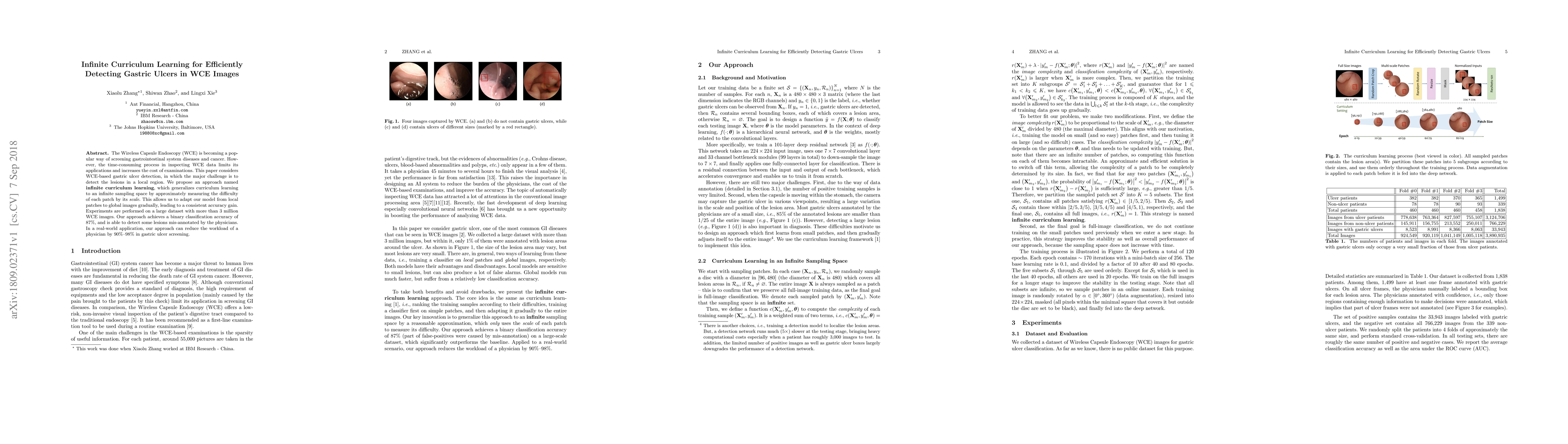 The Wireless Capsule Endoscopy (WCE) is becoming a popular way of screening gastrointestinal system diseases and cancer. However, the time-consuming process in inspecting WCE data limits its applications and increases the cost of examinations. This paper considers WCE-based gastric ulcer detection, in which the major challenge is to detect the lesions in a local region. We propose an approach named infinite curriculum learning, which generalizes curriculum learning to an infinite sampling space by approximately measuring the difficulty of each patch by its scale. This allows us to adapt our model from local patches to global images gradually, leading to a consistent accuracy gain. Experiments are performed on a large dataset with more than 3 million WCE images. Our approach achieves a binary classification accuracy of 87%, and is able to detect some lesions mis-annotated by the physicians. In a real-world application, our approach can reduce the workload of a physician by 90%-98% in gastric ulcer screening.