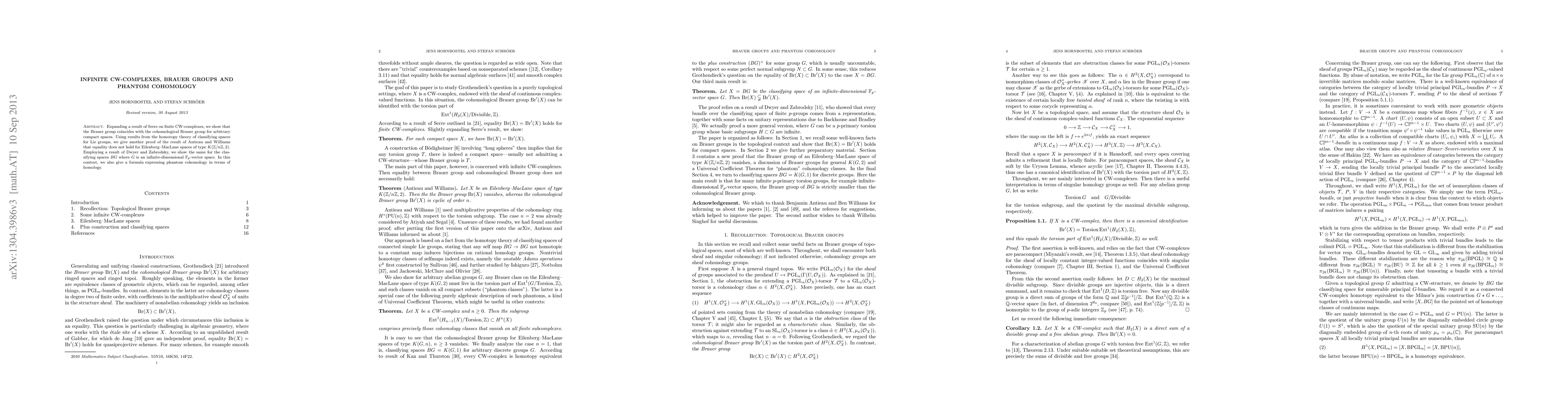 Expanding a result of Serre on finite CW-complexes, we show that the Brauer group coincides with the cohomological Brauer group for arbitrary compact spaces. Using results from the homotopy theory of classifying spaces for Lie groups, we give another proof of the result of Antieau and Williams that equality does not hold for Eilenberg--MacLane spaces of type K(Z/nZ,2). Employing a result of Dwyer and Zabrodsky, we show the same for the classifying spaces BG where G is an infinite-dimensional F_p-vector space. In this context, we also give a formula expressing phantom cohomology in terms of homology.