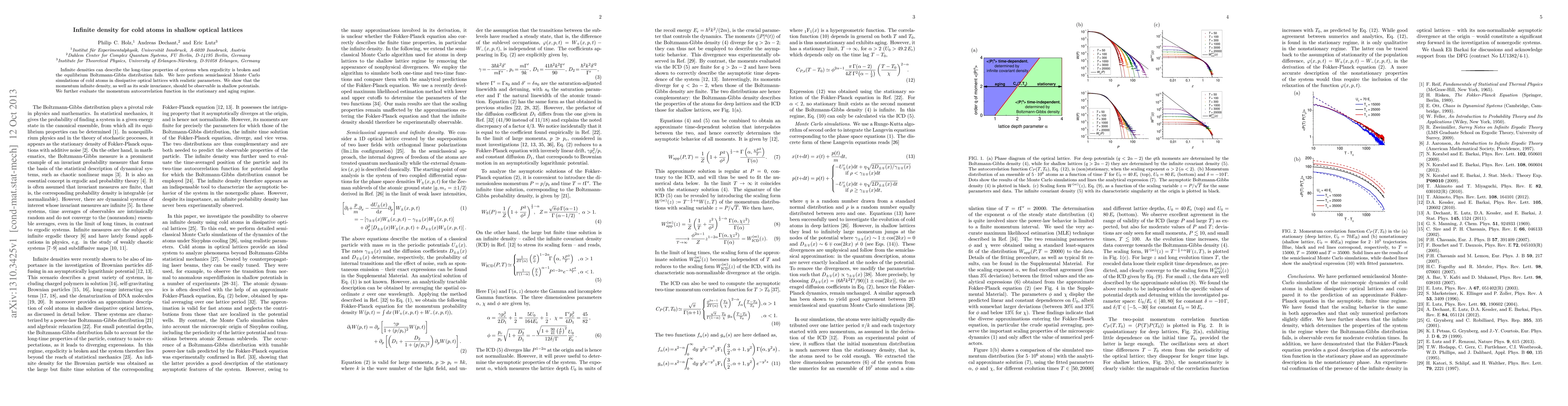 This paper demonstrates through semiclassical Monte Carlo simulations that cold atoms in shallow optical lattices exhibit momentum infinite density, a phenomenon observable in systems where ergodicity is broken. The study also evaluates the momentum autocorrelation function in the stationary and aging regime.