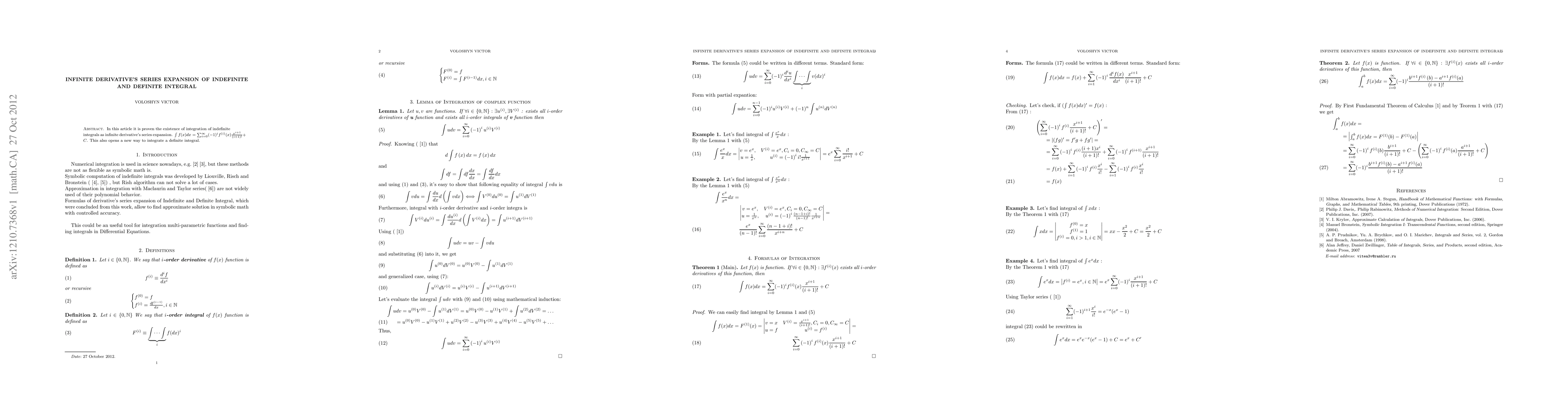 In this article it is proven the existence of integration of indefinite integrals as infinite derivative's series expansion. This also opens a new way to integrate a definite integral.