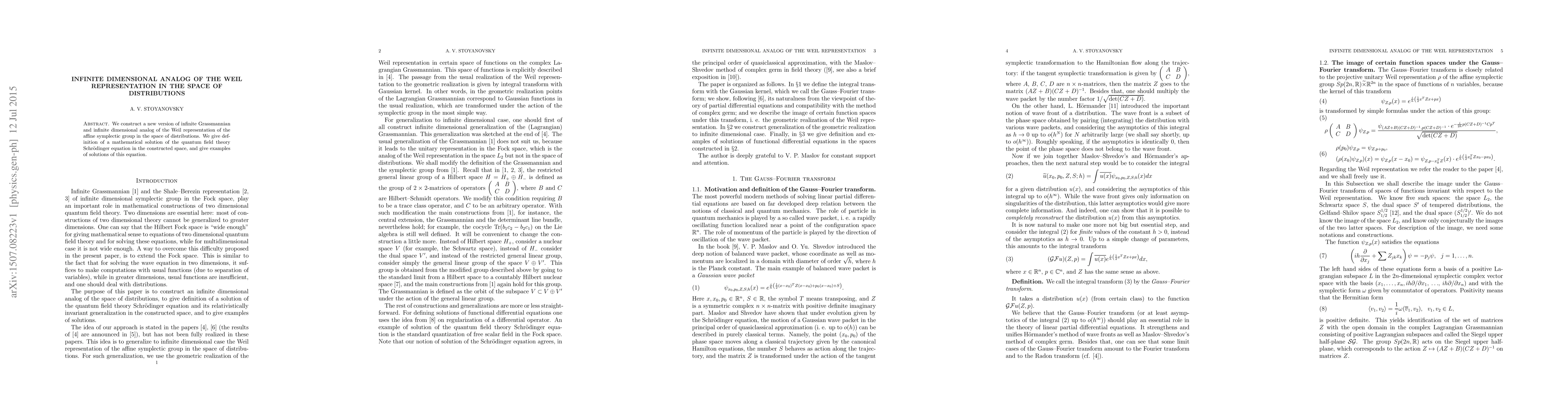 This paper constructs an infinite dimensional analog of the Weil representation within the space of distributions, introducing a new version of the infinite Grassmannian. It defines a mathematical solution for the quantum field theory Schrödinger equation in this new framework and provides examples of such solutions.