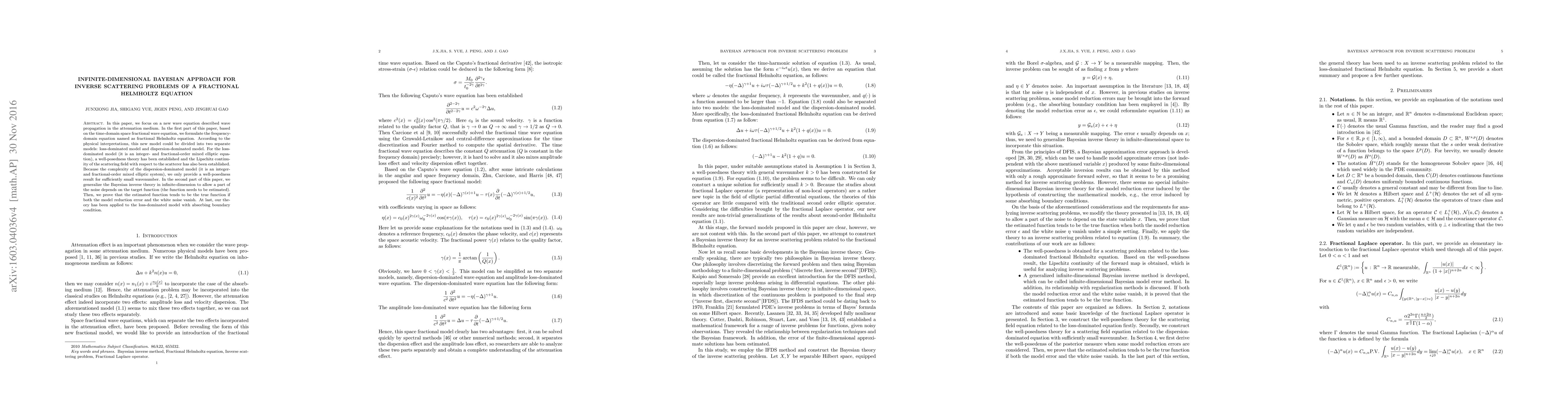 In this paper, we focus on a new wave equation described wave propagation in the attenuation medium. In the first part of this paper, based on the time-domain space fractional wave equation, we formulate the frequency-domain equation named as fractional Helmholtz equation. According to the physical interpretations, this new model could be divided into two separate models: loss-dominated model and dispersion-dominated model. For the loss-dominated model (it is an integer- and fractional-order mixed elliptic equation), a well-posedness theory has been established and the Lipschitz continuity of the scattering field with respect to the scatterer has also been established.Because the complexity of the dispersion-dominated model (it is an integer- and fractional-order mixed elliptic system), we only provide a well-posedness result for sufficiently small wavenumber. In the second part of this paper, we generalize the Bayesian inverse theory in infinite-dimension to allow a part of the noise depends on the target function (the function needs to be estimated). Then, we prove that the estimated function tends to be the true function if both the model reduction error and the white noise vanish. At last, our theory has been applied to the loss-dominated model with absorbing boundary condition.