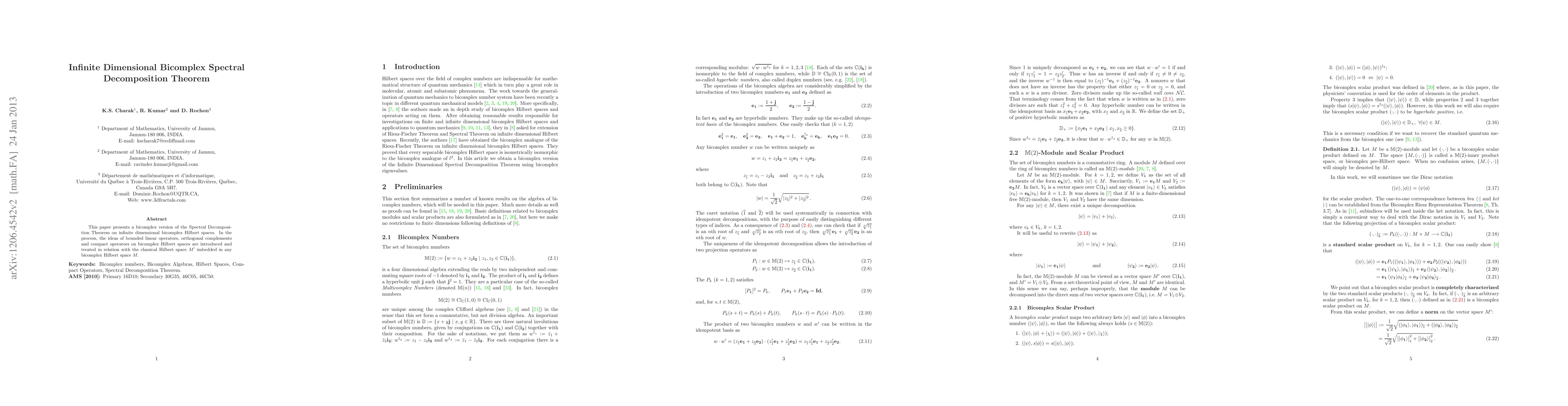 The paper introduces a bicomplex version of the Spectral Decomposition Theorem, along with the necessary definitions and properties of bicomplex Hilbert spaces and operators.