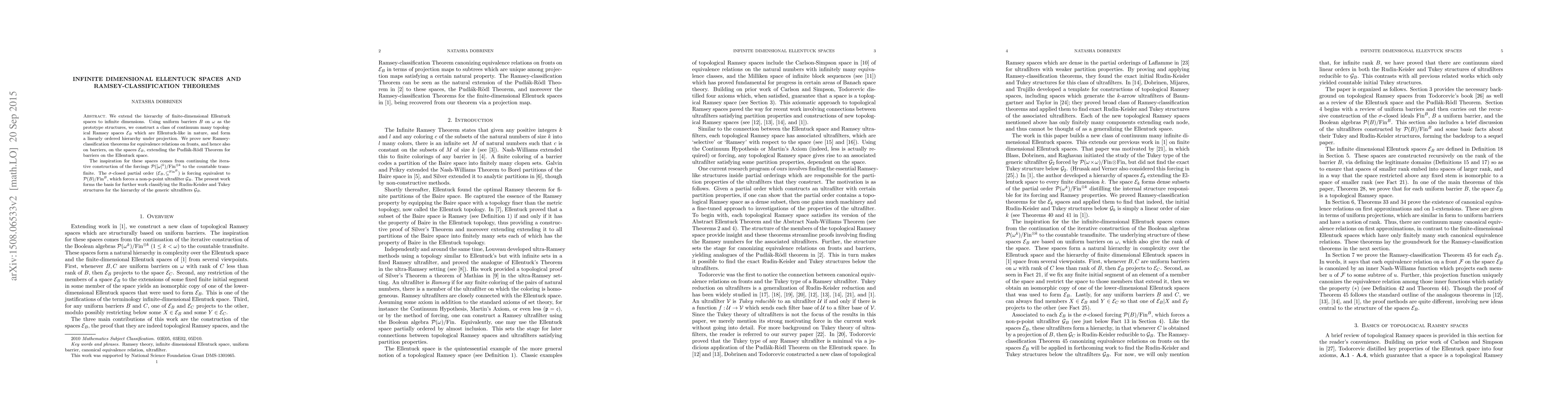 We extend the hierarchy of finite-dimensional Ellentuck spaces to infinite dimensions. Using uniform barriers $B$ on $\omega$ as the prototype structures, we construct a class of continuum many topological Ramsey spaces $\mathcal{E}_B$ which are Ellentuck-like in nature, and form a linearly ordered hierarchy under projection. We prove new Ramsey-classification theorems for equivalence relations on fronts, and hence also on barriers, on the spaces $\mathcal{E}_B$, extending the Pudlak-Rodl Theorem for barriers on the Ellentuck space. The inspiration for these spaces comes from continuing the iterative construction of the forcings $\mathcal{P}([\om]^k)/\Fin^{\otimes k}$ to the countable transfinite. The $\sigma$-closed partial order $(\mathcal{E}_B, \sse^{\Fin^{B}})$ is forcing equivalent to $\mathcal{P}(B)/\Fin^{B}$, which forces a non-p-point ultrafilter $\mathcal{G}_B$. The present work forms the basis for further work classifying the Rudin-Keisler and Tukey structures for the hierarchy of the generic ultrafilters $\mathcal{G}_B$.