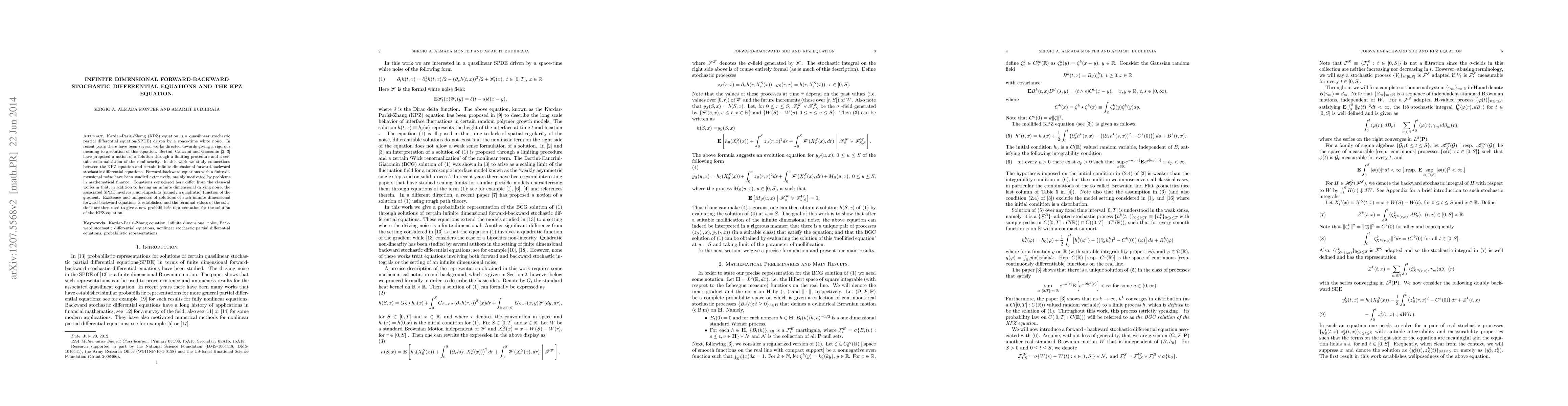 This paper explores the relationship between the KPZ equation and infinite dimensional forward-backward stochastic differential equations, establishing existence and uniqueness for the latter under non-Lipschitz conditions. It provides a new probabilistic representation for the KPZ equation using the terminal values of solutions to these forward-backward equations.