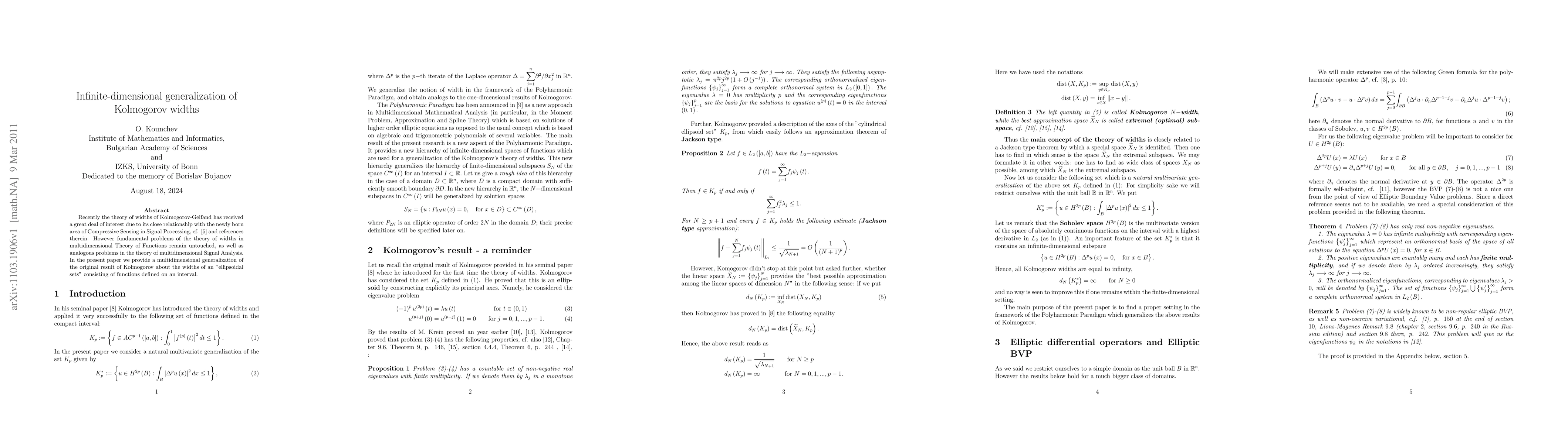 This paper generalizes Kolmogorov's original results on the widths of ellipsoidal sets of functions, extending the theory to a multidimensional framework relevant to Compressive Sensing in Signal Processing and multidimensional Signal Analysis. It addresses previously unexplored fundamental problems in the multidimensional Theory of Functions.