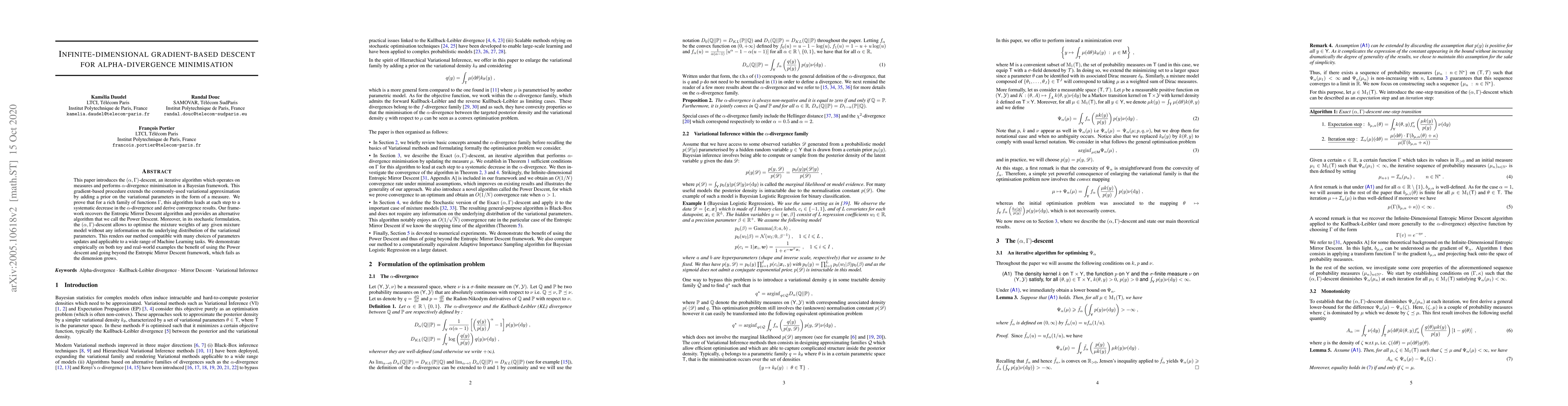 This paper introduces the $(\alpha, \Gamma)$-descent, an iterative algorithm which operates on measures and performs $\alpha$-divergence minimisation in a Bayesian framework. This gradient-based procedure extends the commonly-used variational approximation by adding a prior on the variational parameters in the form of a measure. We prove that for a rich family of functions $\Gamma$, this algorithm leads at each step to a systematic decrease in the $\alpha$-divergence and derive convergence results. Our framework recovers the Entropic Mirror Descent algorithm and provides an alternative algorithm that we call the Power Descent. Moreover, in its stochastic formulation, the $(\alpha, \Gamma)$-descent allows to optimise the mixture weights of any given mixture model without any information on the underlying distribution of the variational parameters. This renders our method compatible with many choices of parameters updates and applicable to a wide range of Machine Learning tasks. We demonstrate empirically on both toy and real-world examples the benefit of using the Power descent and going beyond the Entropic Mirror Descent framework, which fails as the dimension grows.