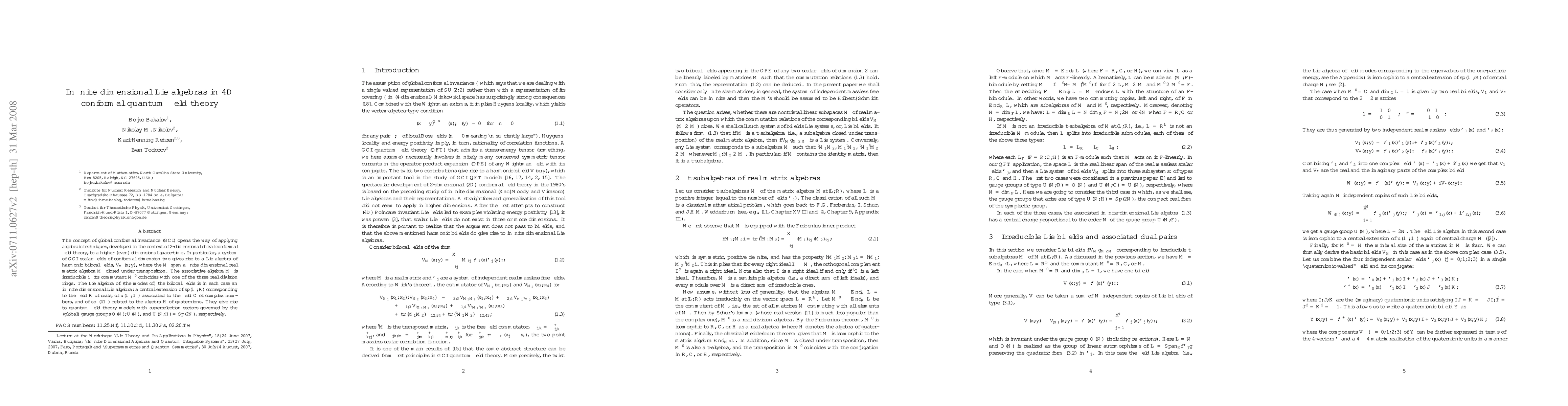 This paper explores the application of algebraic techniques from 2D conformal field theory to 4D space-time, revealing infinite dimensional Lie algebras arising from global conformal invariance. The study identifies specific infinite-dimensional Lie algebras corresponding to different division rings, leading to quantum field theory models with distinct gauge groups.