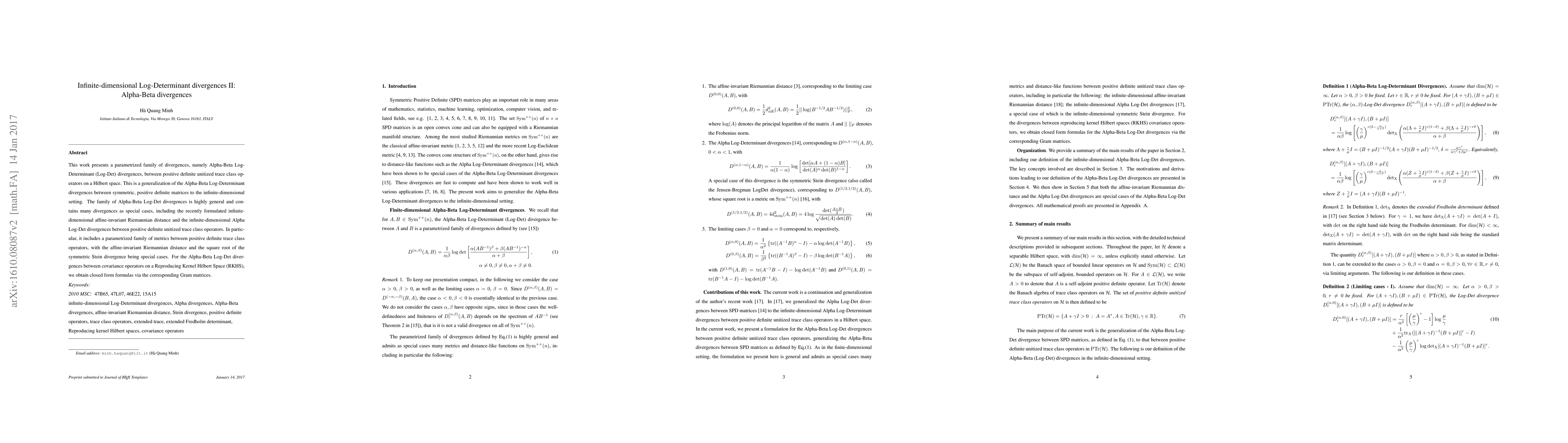 This paper introduces a new family of Alpha-Beta Log-Determinant divergences for infinite-dimensional positive definite unitized trace class operators, extending previous finite-dimensional concepts. It includes various special cases, such as the infinite-dimensional affine-invariant Riemannian distance and the Alpha Log-Det divergences.
