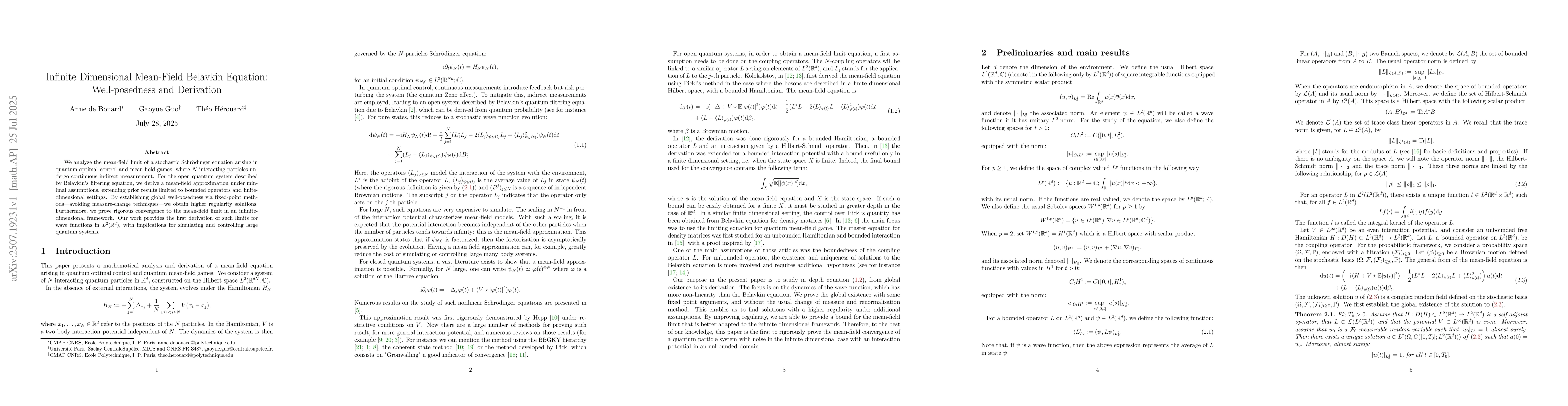 The paper presents a detailed derivation of the infinite-dimensional mean-field Belavkin equation, establishing global well-posedness and proving convergence to the mean-field limit without relying on measure-change techniques.