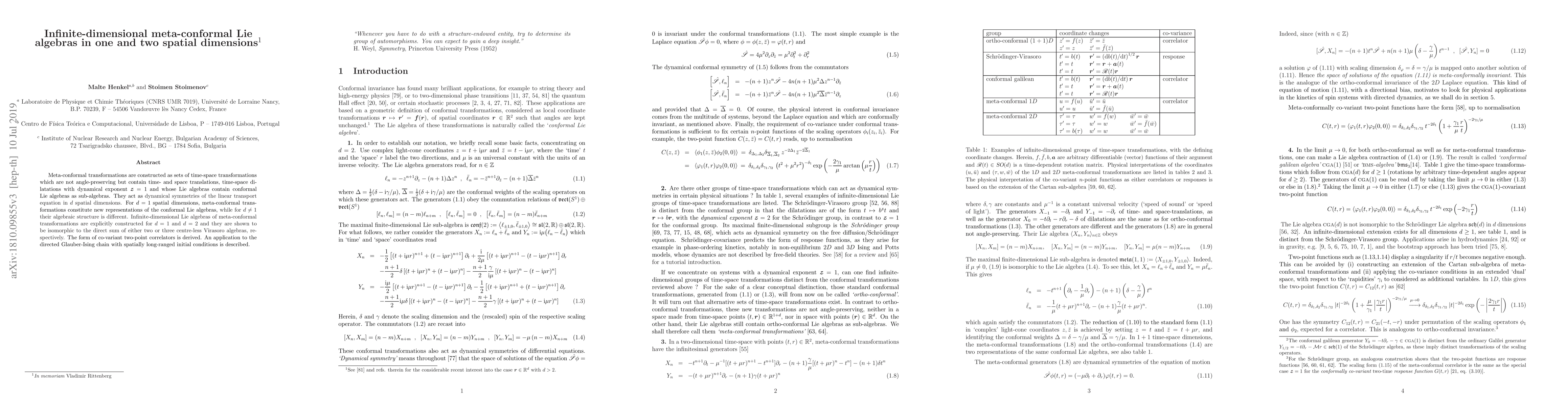 This paper constructs infinite-dimensional meta-conformal Lie algebras for one and two spatial dimensions, showing they are isomorphic to the direct sum of two or three Virasoro algebras. It explores their role as dynamical symmetries of the linear transport equation and derives covariant two-point correlators, with an application to the directed Glauber-Ising chain.