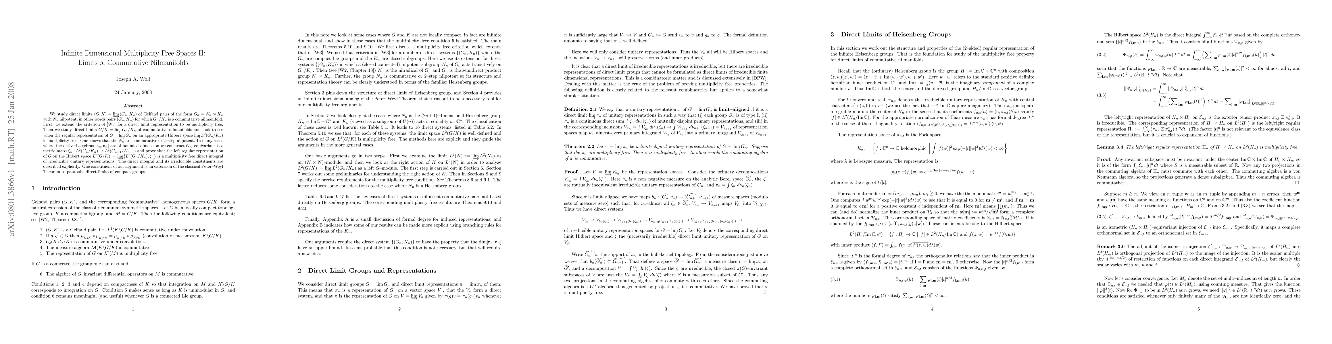 We study direct limits $(G,K) = \varinjlim (G_n,K_n)$ of Gelfand pairs of the form $G_n = N_n\rtimes K_n$ with $N_n$ nilpotent, in other words pairs $(G_n,K_n)$ for which $G_n/K_n$ is a commutative nilmanifold. First, we extend the criterion of \cite{W3} for a direct limit representation to be multiplicity free. Then we study direct limits $G/K = \varinjlim G_n/K_n$ of commutative nilmanifolds and look to see when the regular representation of $G = \varinjlim G_n$ on an appropriate Hilbert space $\varinjlim L^2(G_n/K_n)$ is multiplicity free. One knows that the $N_n$ are commutative or 2--step nilpotent. In many cases where the derived algebras $[\gn_n,\gn_n]$ are of bounded dimension we construct $G_n$--equivariant isometric maps $\zeta_n : L^2(G_n/K_n) \to L^2(G_{n+1}/K_{n+1})$ and prove that the left regular representation of $G$ on the Hilbert space $L^2(G/K) := \varinjlim \{L^2(G_n/K_n),\zeta_n\}$ is a multiplicity free direct integral of irreducible unitary representations. The direct integral and its irreducible constituents are described explicitly. One constituent of our argument is an extension of the classical Peter--Weyl Theorem to parabolic direct limits of compact groups.