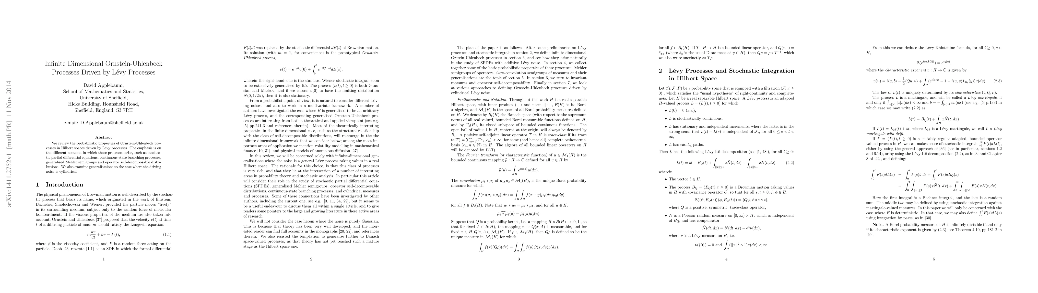 We review the probabilistic properties of Ornstein-Uhlenbeck processes in Hilbert spaces driven by L\'{e}vy processes. The emphasis is on the different contexts in which these processes arise, such as stochastic partial differential equations, continuous-state branching processes, generalised Mehler semigroups and operator self-decomposable distributions. We also examine generalisations to the case where the driving noise is cylindrical.