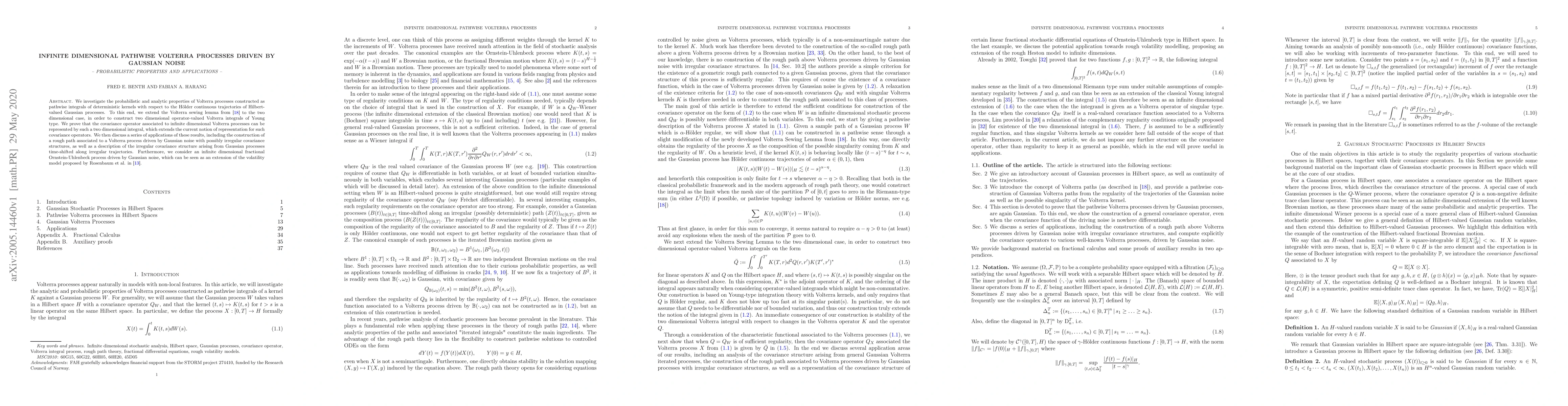 This paper explores the probabilistic and analytic properties of infinite dimensional Volterra processes driven by Gaussian noise, extending the Volterra sewing lemma to construct two-dimensional operator-valued integrals. It also discusses applications, including the construction of rough paths and the modeling of irregular covariance structures in Gaussian processes.