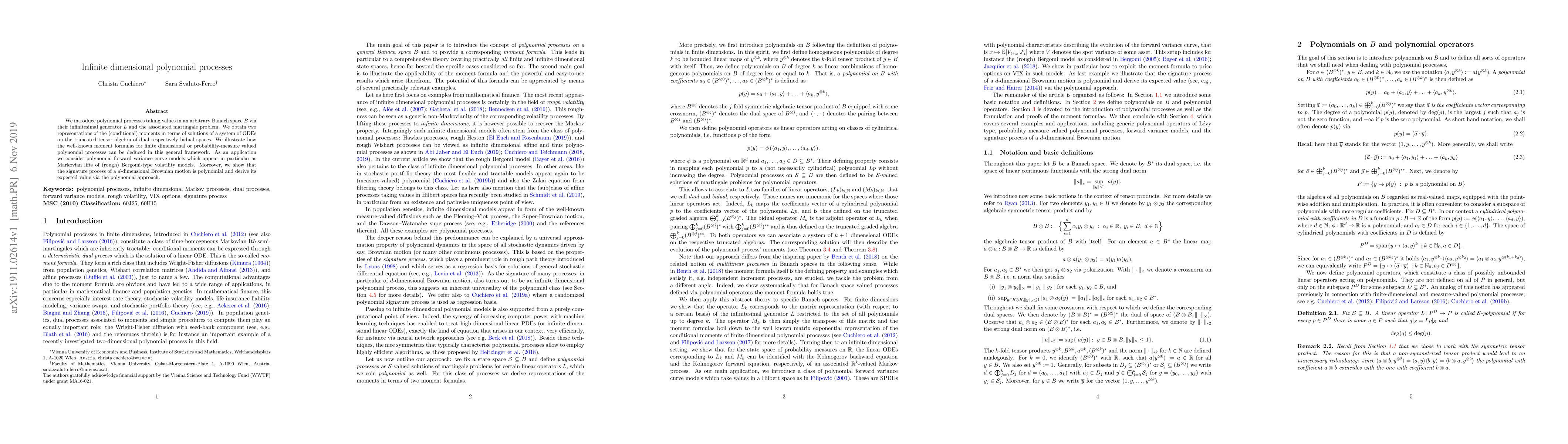 We introduce polynomial processes taking values in an arbitrary Banach space $B$ via their infinitesimal generator $L$ and the associated martingale problem. We obtain two representations of the (conditional) moments in terms of solutions of a system of ODEs on the truncated tensor algebra of dual respectively bidual spaces. We illustrate how the well-known moment formulas for finite dimensional or probability-measure valued polynomial processes can be deduced in this general framework. As an application we consider polynomial forward variance curve models which appear in particular as Markovian lifts of (rough) Bergomi-type volatility models. Moreover, we show that the signature process of a $d$-dimensional Brownian motion is polynomial and derive its expected value via the polynomial approach.