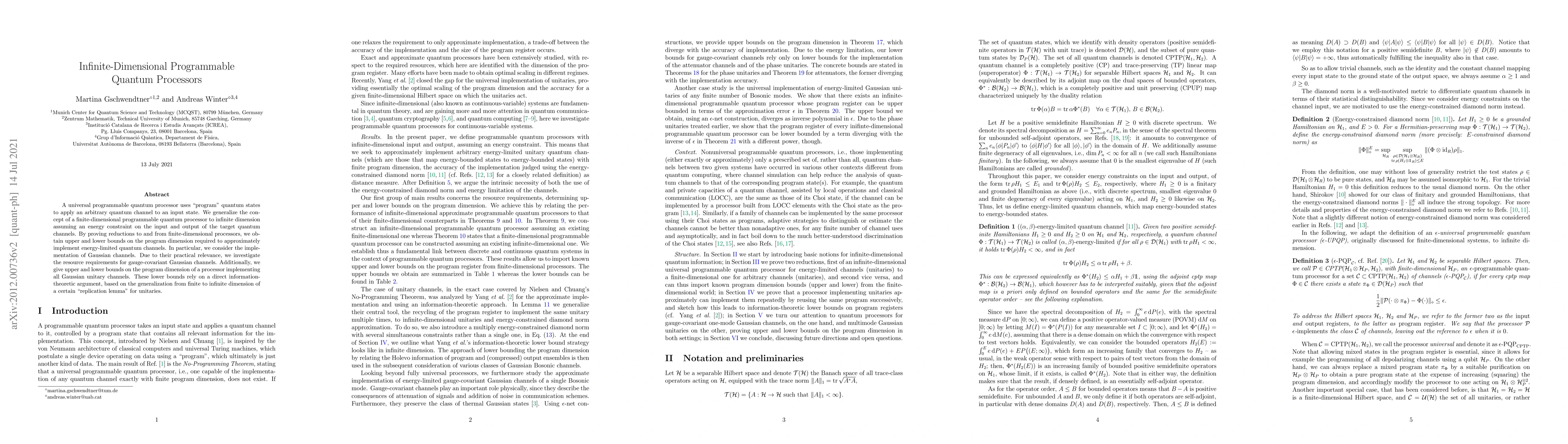 A universal programmable quantum processor uses program quantum states to apply an arbitrary quantum channel to an input state. We generalize the concept of a finite-dimensional programmable quantum processor to infinite dimension assuming an energy constraint on the input and output of the target quantum channels. By proving reductions to and from finite-dimensional processors, we obtain upper and lower bounds on the program dimension required to approximately implement energy-limited quantum channels. In particular, we consider the implementation of Gaussian channels. Due to their practical relevance, we investigate the resource requirements for gauge-covariant Gaussian channels. Additionally, we give upper and lower bounds on the program dimension of a processor implementing all Gaussian unitary channels. These lower bounds rely on a direct information-theoretic argument, based on the generalization from finite to infinite dimension of a certain replication lemma for unitaries.