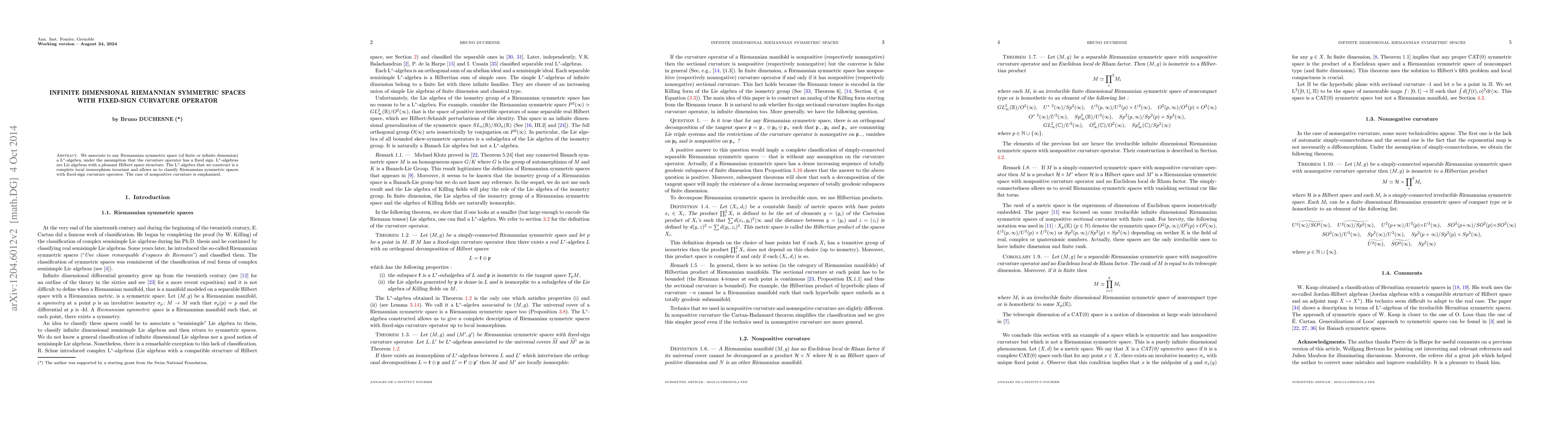 Researchers created a way to classify infinite-dimensional Riemannian symmetric spaces with fixed-sign curvature operators by associating them with L*$-algebras, providing a new approach to understanding these complex spaces.