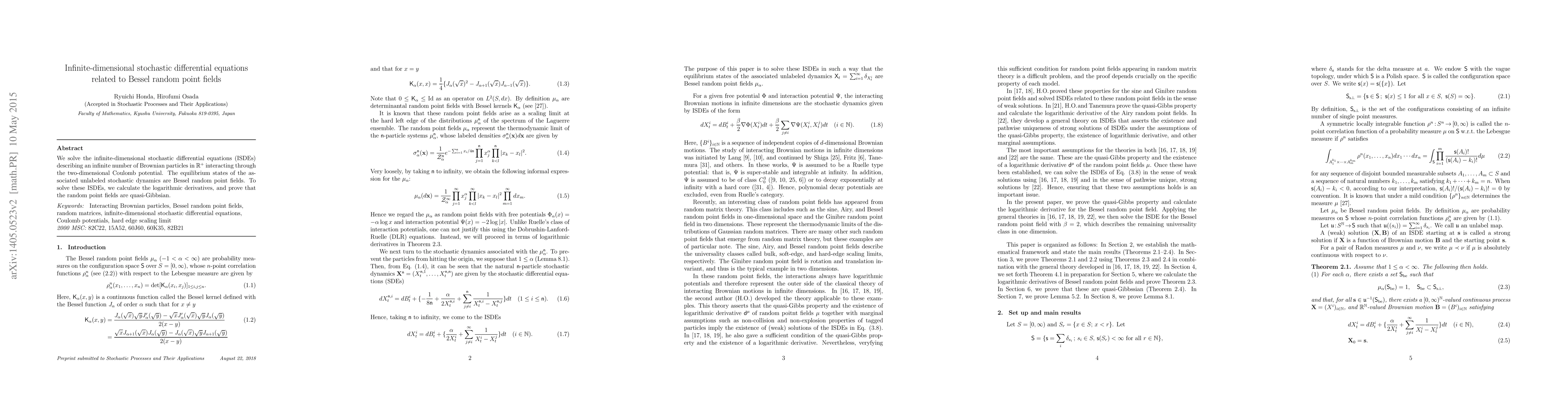 This paper solves infinite-dimensional stochastic differential equations modeling Brownian particles interacting via a Coulomb potential, revealing that their equilibrium states form Bessel random point fields. The authors prove these fields are quasi-Gibbsian by calculating logarithmic derivatives.