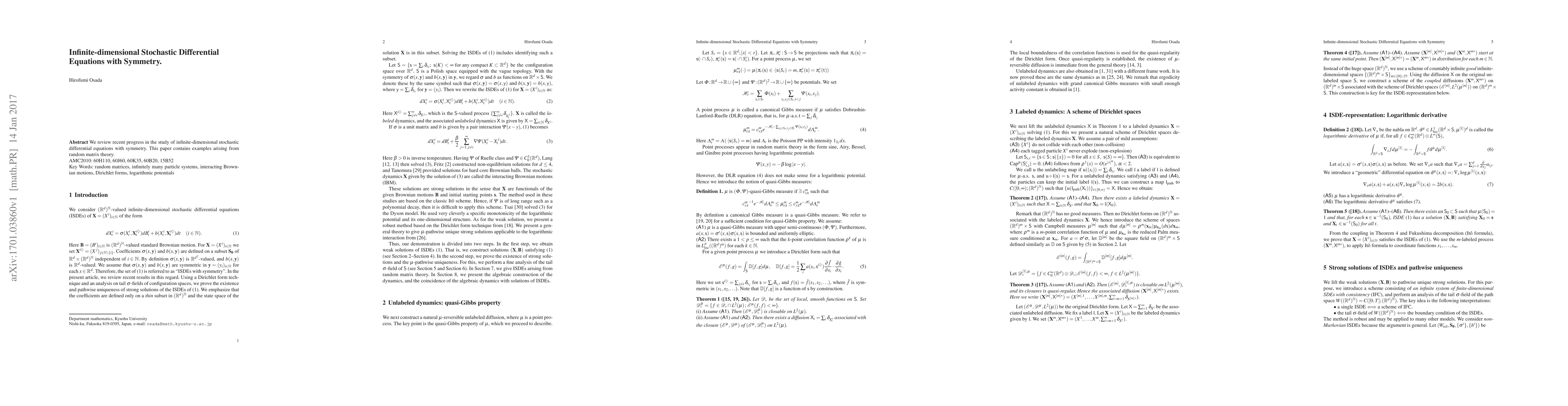 The paper reviews progress in studying infinite-dimensional stochastic differential equations (SDEs) with symmetry, focusing on examples from random matrix theory, and utilizing Dirichlet forms and general theory for existence proofs.