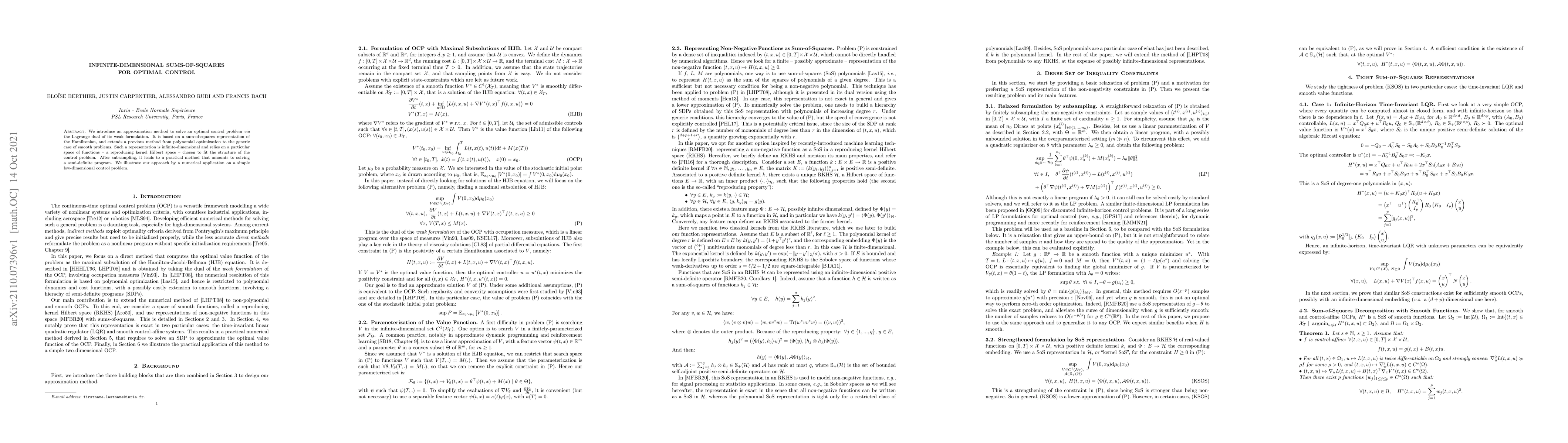 We introduce an approximation method to solve an optimal control problem via the Lagrange dual of its weak formulation. It is based on a sum-of-squares representation of the Hamiltonian, and extends a previous method from polynomial optimization to the generic case of smooth problems. Such a representation is infinite-dimensional and relies on a particular space of functions-a reproducing kernel Hilbert space-chosen to fit the structure of the control problem. After subsampling, it leads to a practical method that amounts to solving a semi-definite program. We illustrate our approach by a numerical application on a simple low-dimensional control problem.