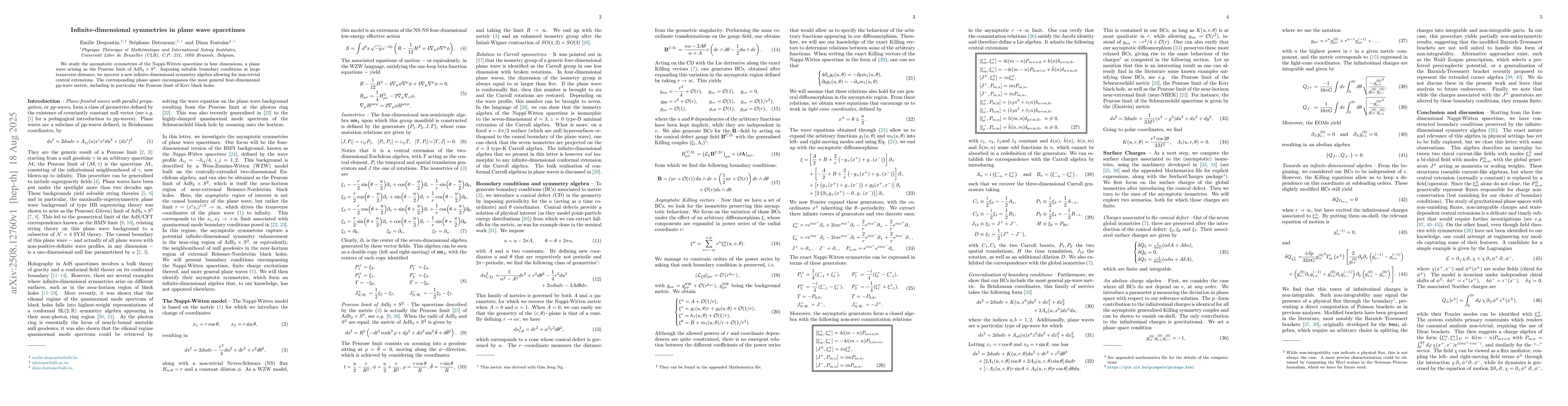 We study the asymptotic symmetries of the Nappi-Witten spacetime in four dimensions, a plane wave arising as the Penrose limit of AdS$_2\times S^2$. Imposing suitable boundary conditions at large transverse distance, we uncover a new infinite-dimensional symmetry algebra allowing for non-trivial central extensions. The corresponding phase space encompasses the most general four-dimensional pp-wave metric, including in particular the Penrose limit of Kerr black holes.