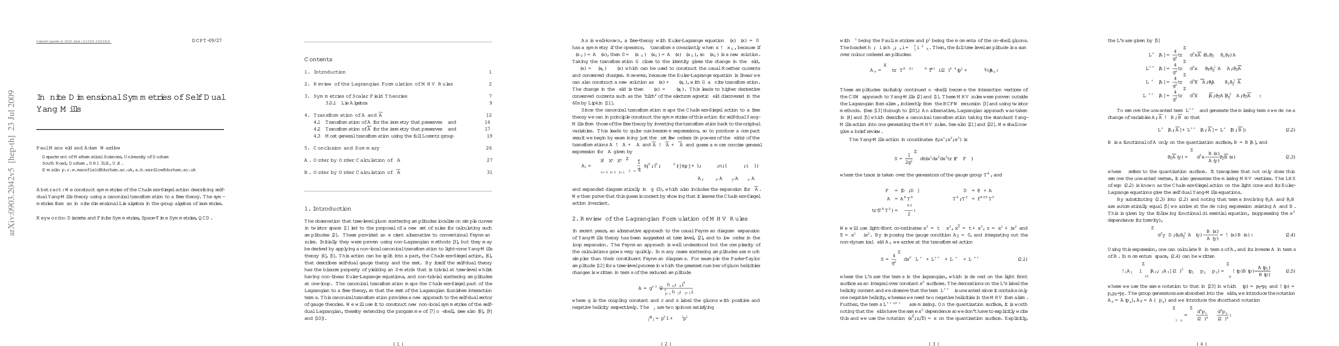 This paper constructs infinite dimensional symmetries for self-dual Yang-Mills theory via a canonical transformation to a free theory, revealing these symmetries as an infinite dimensional Lie algebra within the group algebra of isometries.