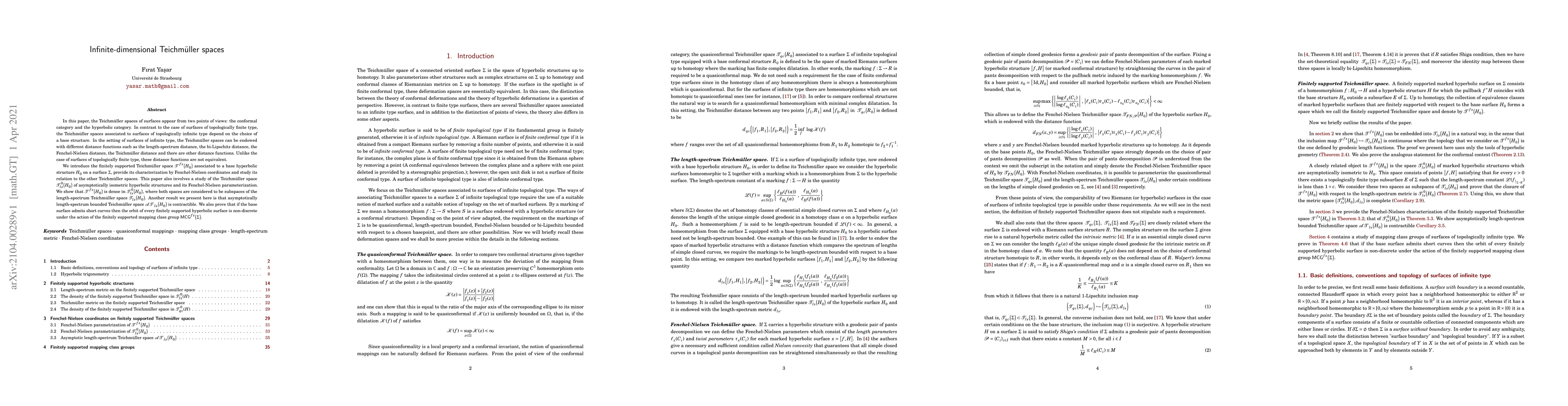This paper explores Teichmüller spaces of surfaces with infinite topological type, introducing various distance functions and comparing their equivalence. It characterizes finitely supported Teichmüller spaces and establishes their denseness in asymptotically isometric hyperbolic structures, proving contractibility of bounded Teichmüller space and non-discreteness of orbits under certain conditions.