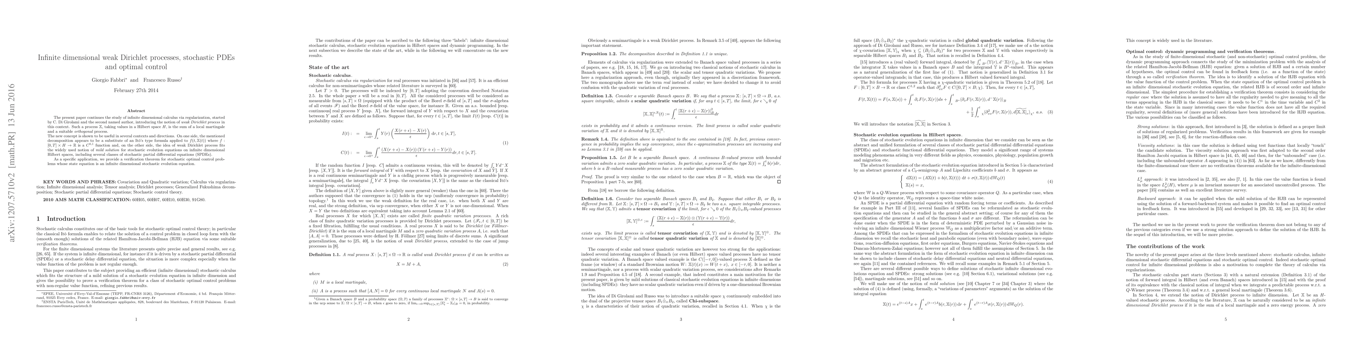 This paper introduces the concept of "weak Dirichlet processes" in infinite dimensional calculus, showing their utility in decomposing functions and solving stochastic partial differential equations (PDEs). It also provides a verification theorem for stochastic optimal control problems involving infinite dimensional stochastic evolution equations.