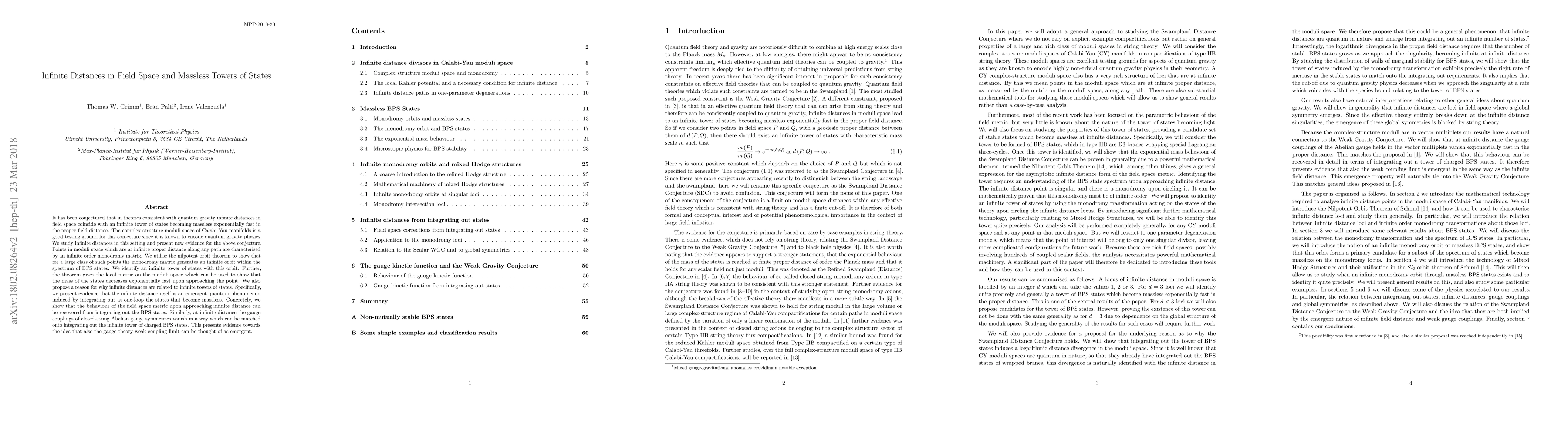 This paper investigates the conjecture linking infinite distances in field space to an exponentially fast emergence of a massless tower of states in quantum gravity theories. It finds support for this in the complex-structure moduli space of Calabi-Yau manifolds, showing that infinite distances correspond to infinite order monodromy matrices and an infinite orbit of BPS states, suggesting the infinite distance is an emergent quantum phenomenon from integrating out these massless states.