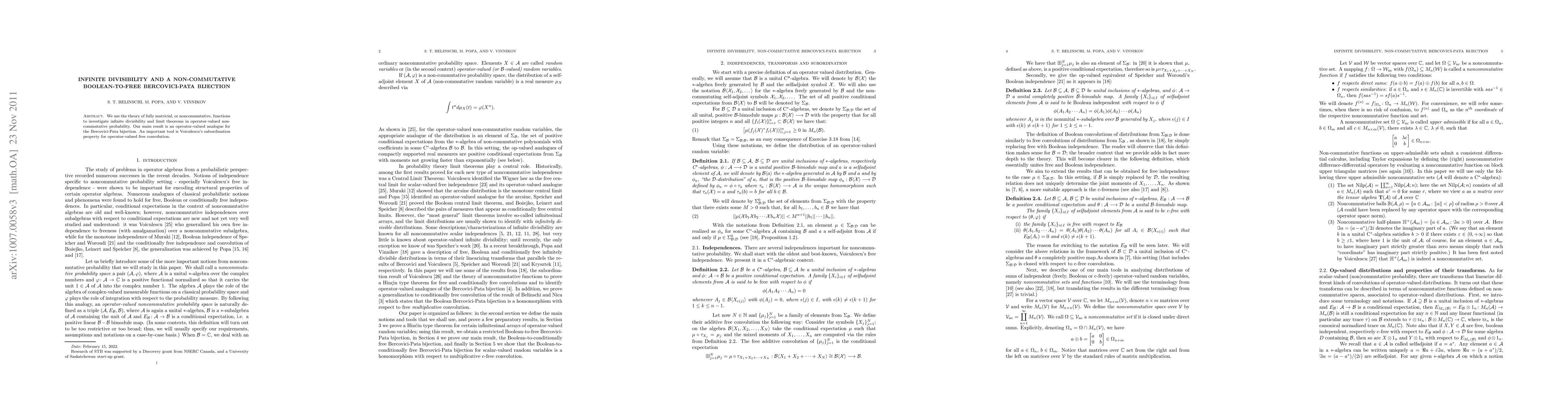 This paper explores infinite divisibility and limit theorems in operator-valued non-commutative probability using fully matricial functions. The main result is an operator-valued version of the Bercovici-Pata bijection, leveraging Voiculescu's subordination property for operator-valued free convolution.
