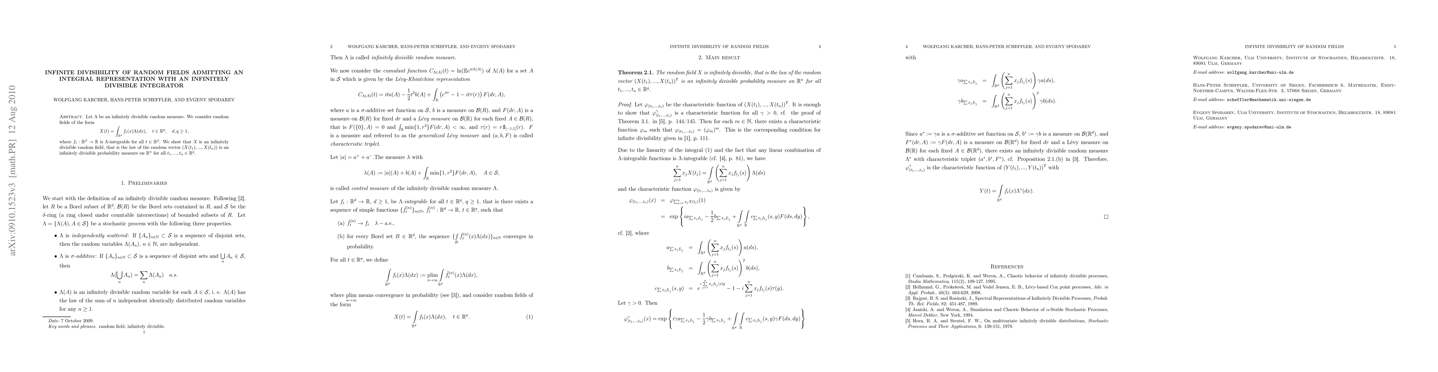Summary: This paper demonstrates that random fields represented as integrals of deterministic functions with respect to infinitely divisible random measures are themselves infinitely divisible. The study focuses on the infinite divisibility property of such random fields.