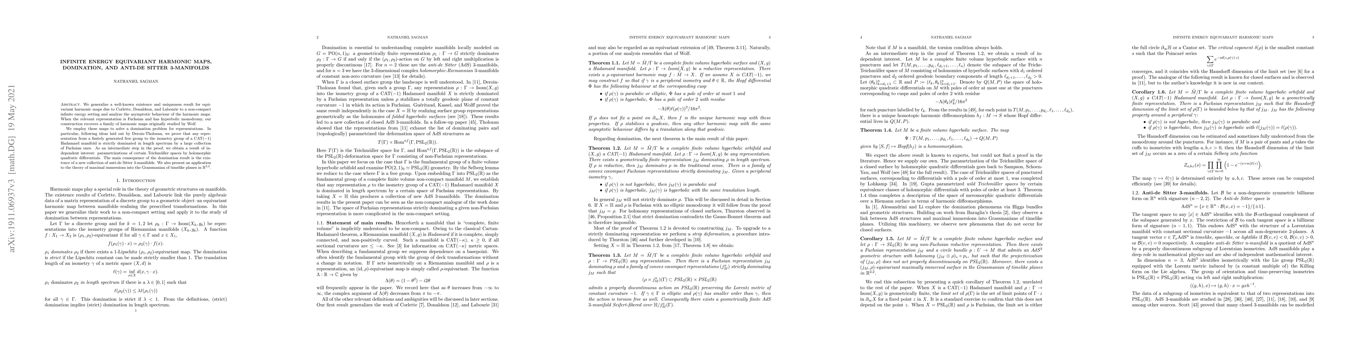 This paper generalizes the existence and uniqueness of equivariant harmonic maps to infinite energy settings and analyzes their asymptotic behavior. It proves a domination result for representations of free groups into the isometry group of CAT(-1) manifolds, leading to the existence of new anti-de Sitter 3-manifolds and applications to minimal immersions in the Grassmannian of timelike planes.