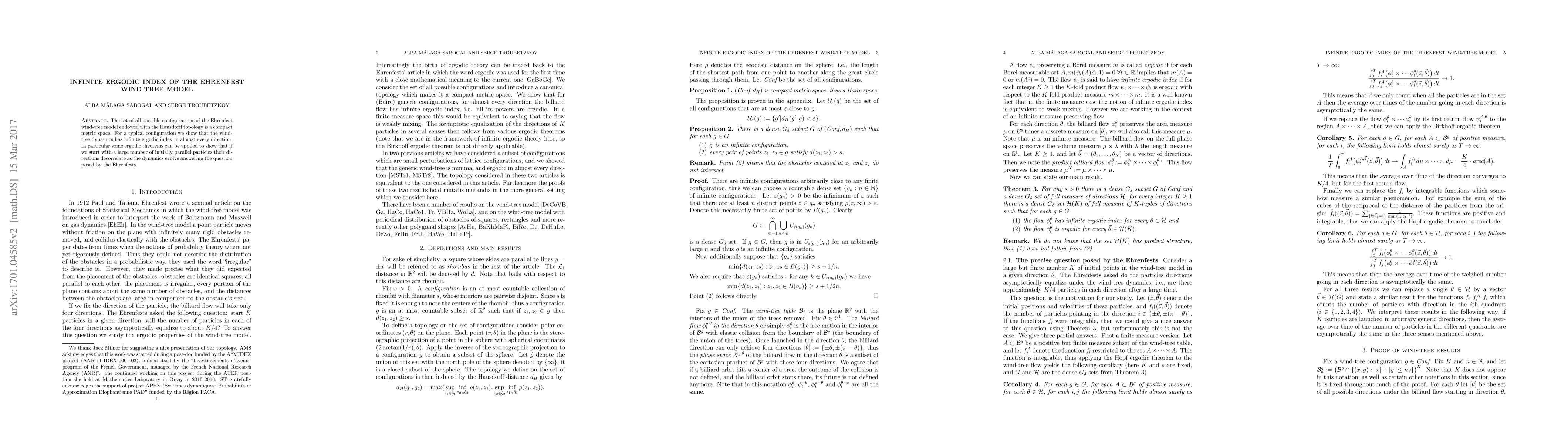 The Ehrenfest wind-tree model's configurations, viewed with Hausdorff topology, form a compact metric space. The dynamics exhibit infinite ergodic index in almost every direction, demonstrating that initially parallel particles' directions decorrelate over time.
