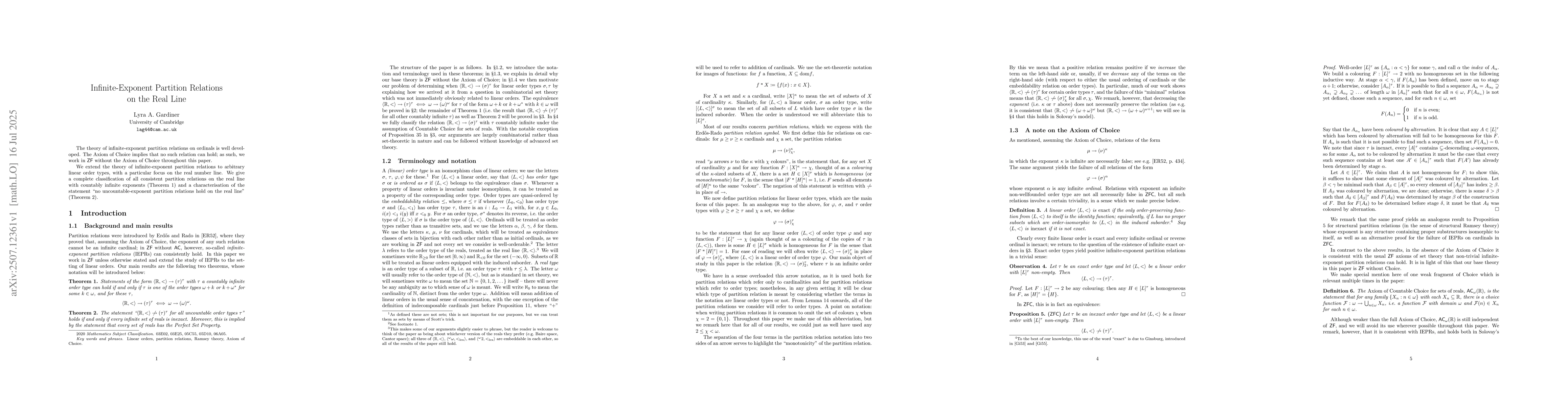 We extend the theory of infinite-exponent partition relations to arbitrary linear order types, with a particular focus on the real number line. We give a complete classification of all consistent partition relations on the real line with countably infinite exponents, and a characterisation of the statement "no uncountable-exponent partition relations hold on the real line", working throughout in ZF without the Axiom of Choice.