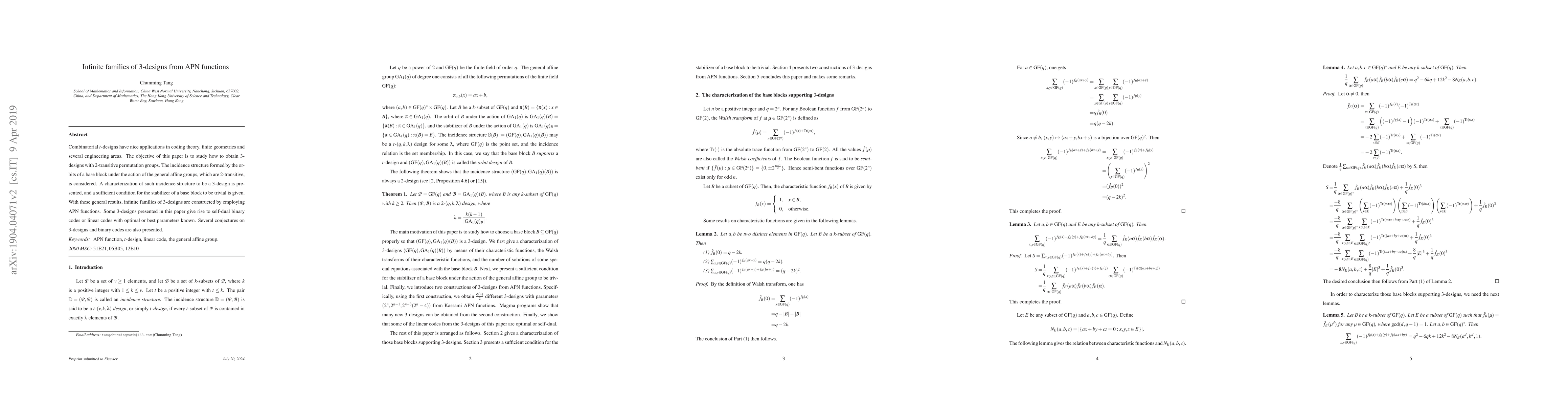 This paper studies the construction of infinite families of 3-designs using APN functions and general affine groups, focusing on $2$-transitive permutation groups. It provides a characterization for these incidence structures to be $3$-designs and presents self-dual binary codes or optimal linear codes as results.