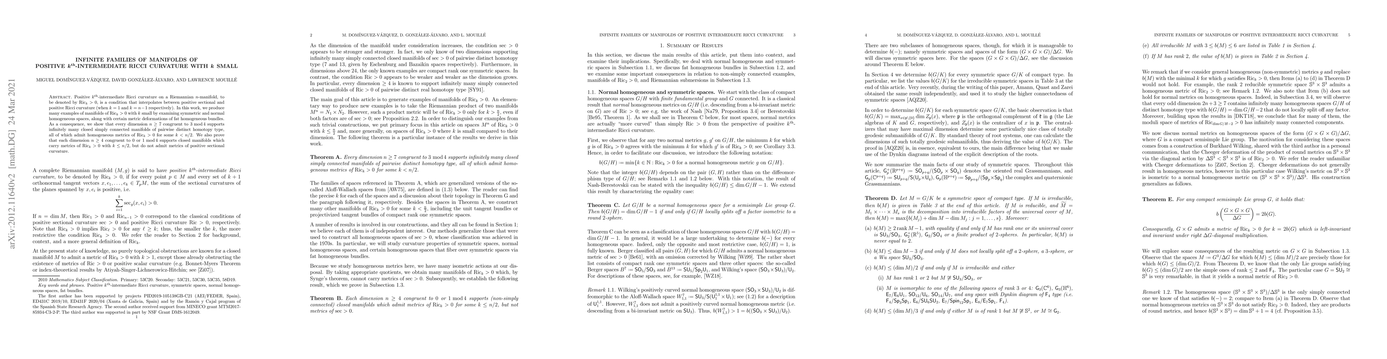 This research presents infinite families of manifolds with positive kth-intermediate Ricci curvature, where k is small. It demonstrates examples via symmetric and normal homogeneous spaces, and metric deformations of fat homogeneous bundles. The findings reveal that dimensions congruent to 3 mod 4 (n≥7) support infinitely many closed simply connected manifolds of distinct homotopy types, each with homogeneous metrics of positive kth-intermediate Ricci curvature for k<n/2. Additionally, dimensions congruent to 0 or 1 mod 4 (n≥4) support closed manifolds with such metrics but without positive sectional curvature metrics.