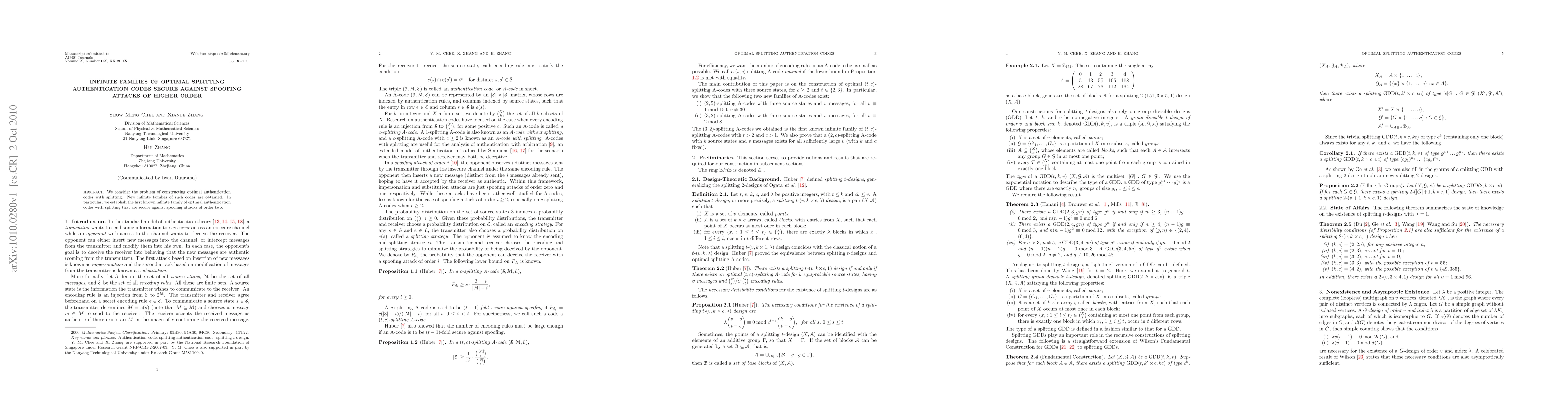 We consider the problem of constructing optimal authentication codes with splitting. New infinite families of such codes are obtained. In particular, we establish the first known infinite family of optimal authentication codes with splitting that are secure against spoofing attacks of order two.