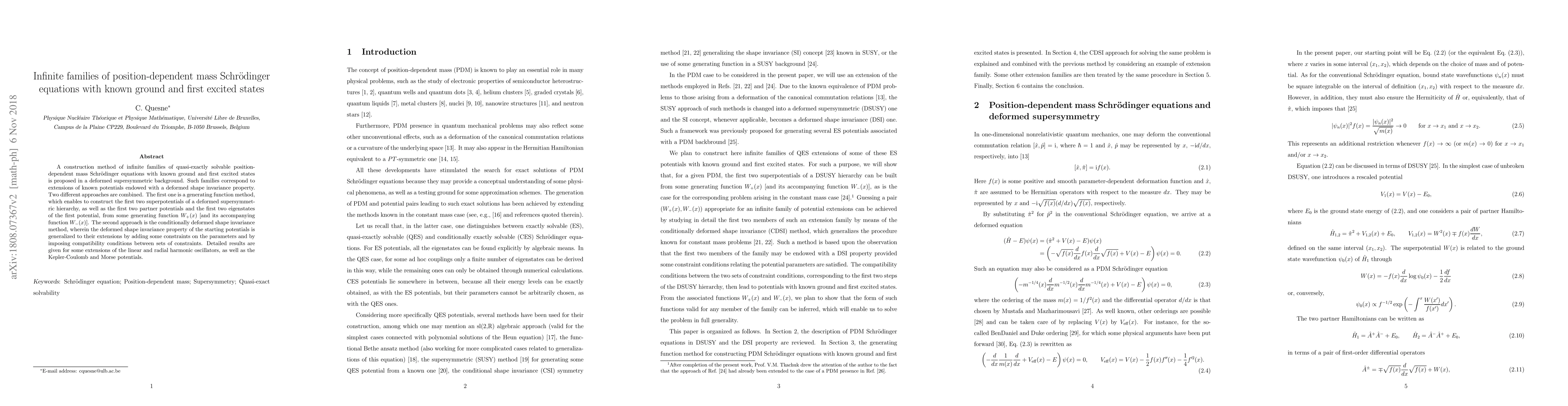 A construction method of infinite families of quasi-exactly solvable position-dependent mass Schr\"odinger equations with known ground and first excited states is proposed in a deformed supersymmetric background. Such families correspond to extensions of known potentials endowed with a deformed shape invariance property. Two different approaches are combined. The first one is a generating function method, which enables to construct the first two superpotentials of a deformed supersymmetric hierarchy, as well as the first two partner potentials and the first two eigenstates of the first potential, from some generating function $W_+(x)$ [and its accompanying function $W_-(x)$]. The second approach is the conditionally deformed shape invariance method, wherein the deformed shape invariance property of the starting potentials is generalized to their extensions by adding some constraints on the parameters and by imposing compatibility conditions between sets of constraints. Detailed results are given for some extensions of the linear and radial harmonic oscillators, as well as the Kepler-Coulomb and Morse potentials.