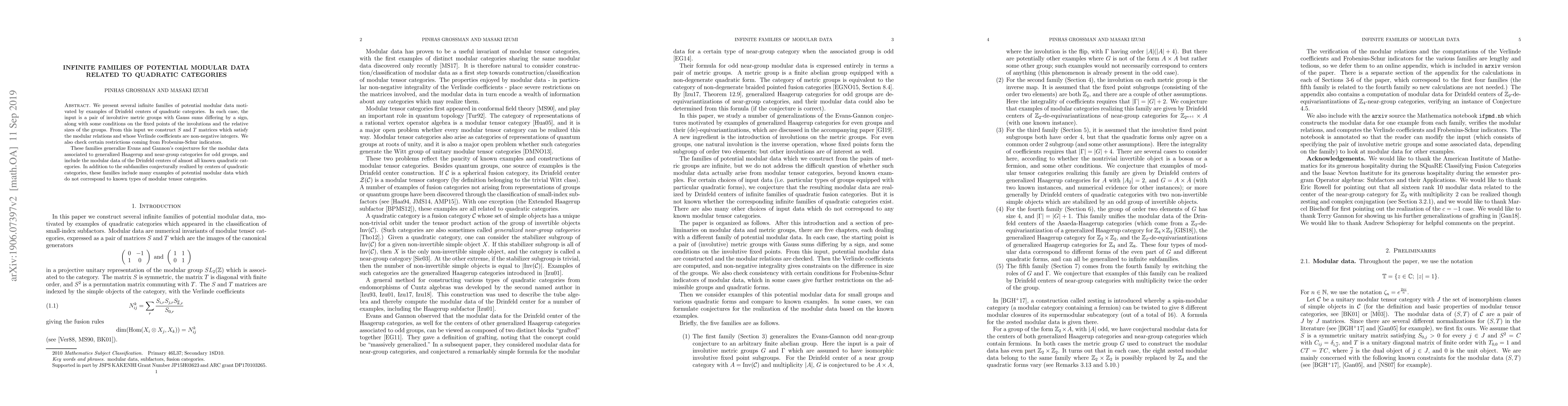We present several infinite families of potential modular data motivated by examples of Drinfeld centers of quadratic categories. In each case, the input is a pair of involutive metric groups with Gauss sums differing by a sign, along with some conditions on the fixed points of the involutions and the relative sizes of the groups. From this input we construct $S$ and $T$ matrices which satisfy the modular relations and whose Verlinde coefficients are non-negative integers. We also check certain restrictions coming from Frobenius-Schur indicators. These families generalize Evans and Gannon's conjectures for the modular data associated to generalized Haagerup and near-group categories for odd groups, and include the modular data of the Drinfeld centers of almost all known quadratic categories. In addition to the subfamilies which are conjecturally realized by centers of quadratic categories, these families include many examples of potential modular data which do not correspond to known types of modular tensor categories.