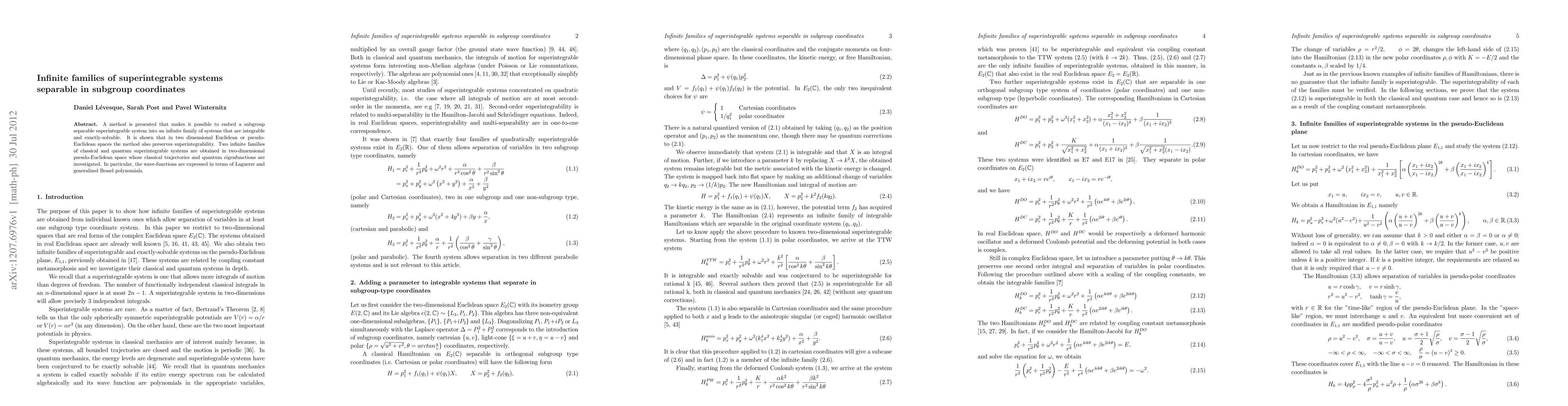 This paper introduces a method to embed subgroup separable superintegrable systems into infinite families of integrable and exactly-solvable systems, preserving superintegrability in two-dimensional Euclidean or pseudo-Euclidean spaces. It investigates two-dimensional pseudo-Euclidean space systems, expressing quantum eigenfunctions using Laguerre and generalized Bessel polynomials.