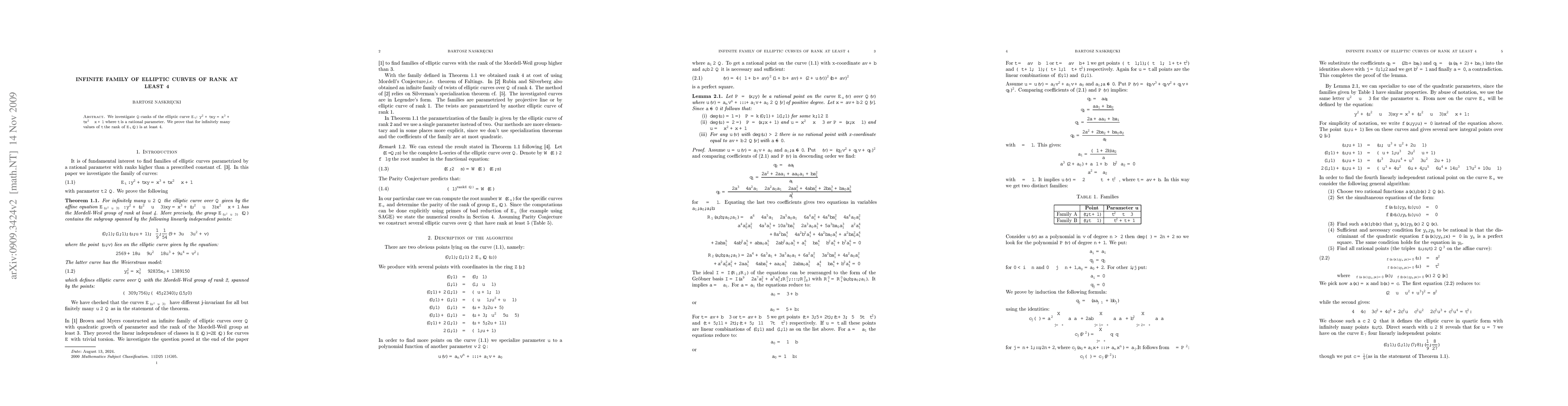 We investigate $\mathbb{Q}$-ranks of the elliptic curve $E_t$: $y^2+txy=x^3+tx^2-x+1$ where $t$ is a rational parameter. We prove that for infinitely many values of $t$ the rank of $E_t(\mathbb{Q})$ is at least 4.