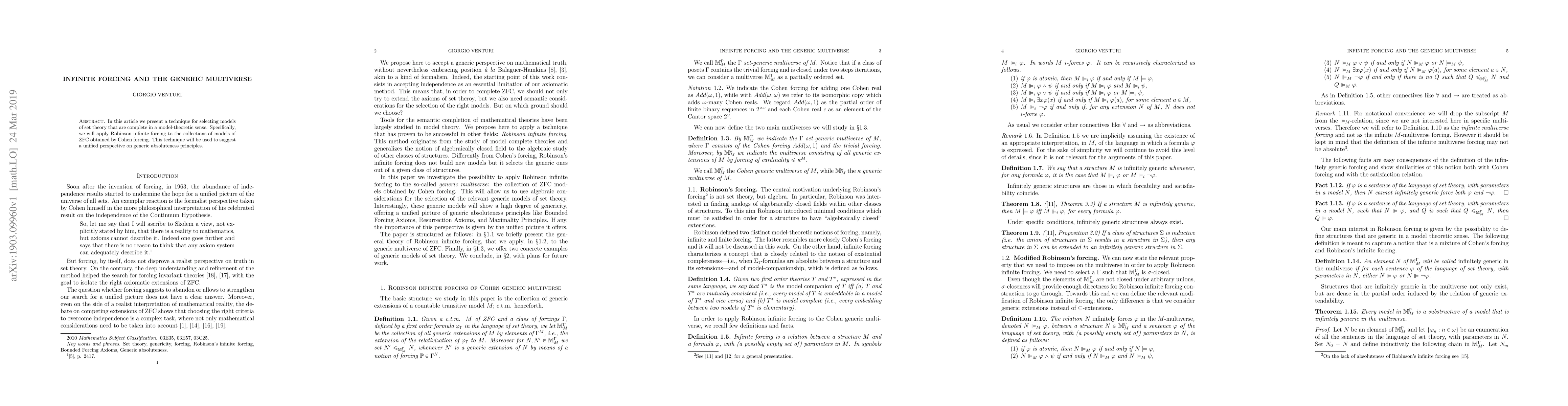 Summary: The paper introduces Robinson infinite forcing applied to models of ZFC from Cohen forcing, aiming to select complete models in set theory and provide a unified view of generic absoluteness principles.