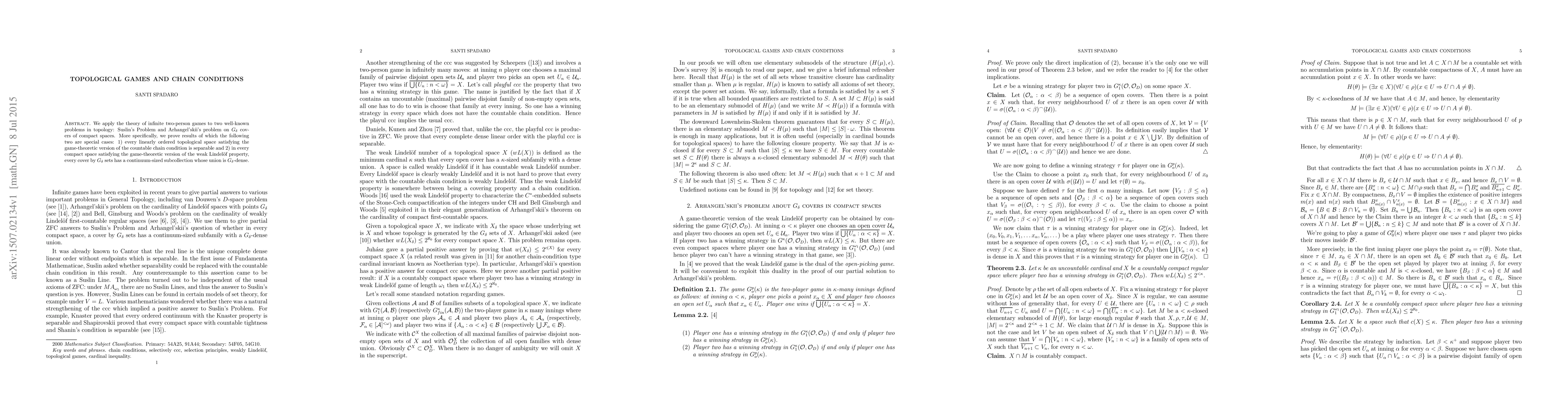 We apply the theory of infinite two-person games to two well-known problems in topology: Suslin's Problem and Arhangel'skii's problem on $G_\delta$ covers of compact spaces. More specifically, we prove results of which the following two are special cases: 1) every linearly ordered topological space satisfying the game-theoretic version of the countable chain condition is separable and 2) in every compact space satisfying the game-theoretic version of the weak Lindel\"of property, every cover by $G_\delta$ sets has a continuum-sized subcollection whose union is $G_\delta$-dense.