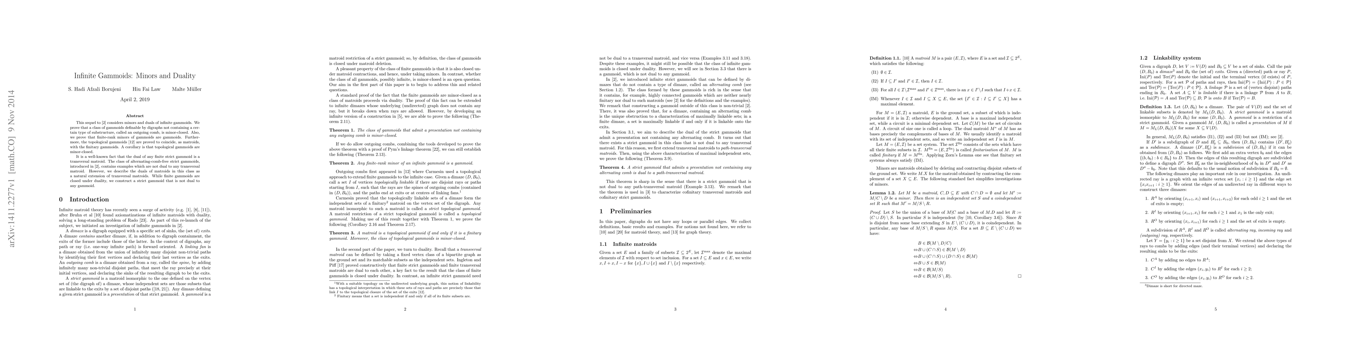 This paper explores minors and duality in infinite gammoids, proving that certain classes are minor-closed and that finite-rank minors of gammoids remain gammoids. It also extends the duality of finite gammoids to describe the duals of a specific class of strict gammoids as an extension of transversal matroids.